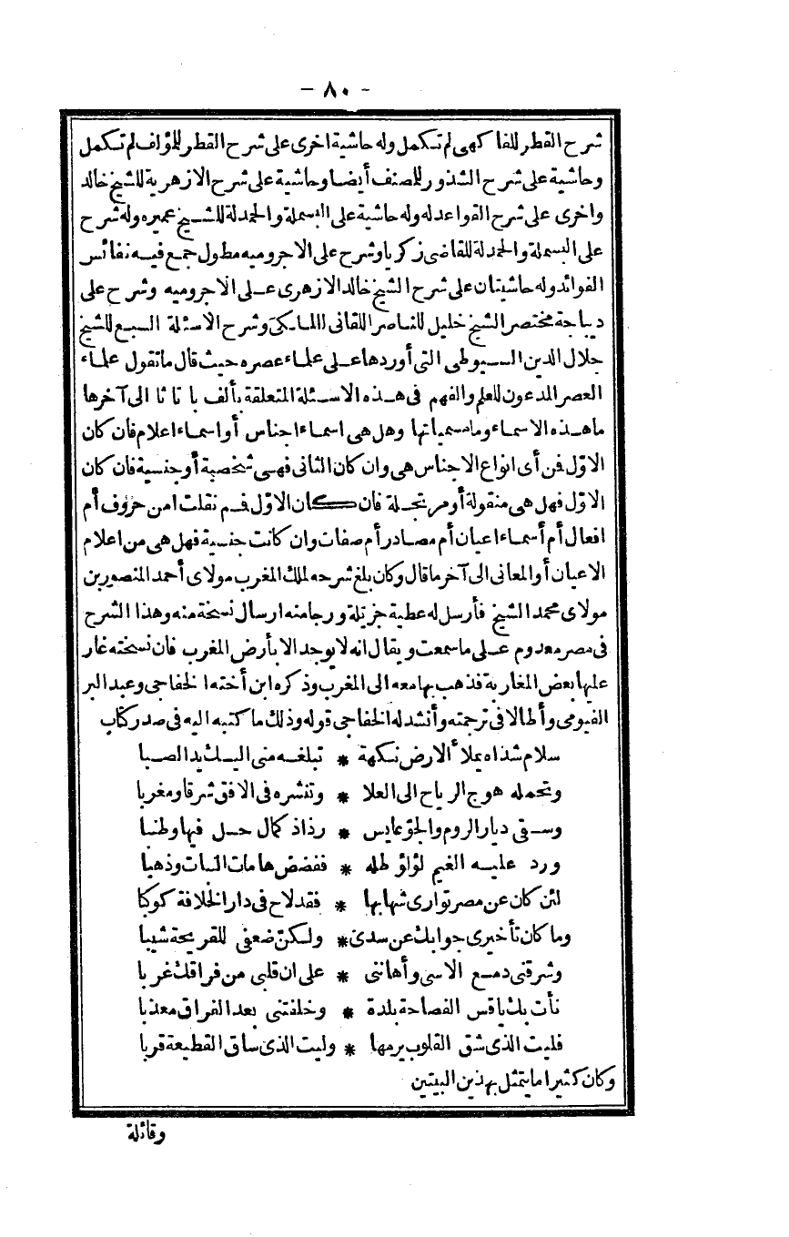 شرح الْقطر للفاكهي لم تكمل وَله حَاشِيَة أُخْرَى على شرح الْقطر للمؤلف لم تكمل وحاشية على شرح الشذور للْمُصَنف أَيْضا وحاشية على شرح الأزهرية للشَّيْخ خَالِد وَأُخْرَى على شرح الْقَوَاعِد لَهُ وَله حَاشِيَة على الْبَسْمَلَة والحمدلة للشَّيْخ عميرَة وَله شرح على الْبَسْمَلَة والحمدلة للْقَاضِي زَكَرِيَّا وَشرح على الأجرومية مطول جمع فِيهِ نفائس الْفَوَائِد وَله حاشيتان على شرح الشَّيْخ خَالِد الْأَزْهَرِي على الأجرومية وَشرح على ديباجة مُخْتَصر الشَّيْخ خَلِيل للناصر اللَّقَّانِيّ الْمَالِكِي وَشرح الأسئلة السَّبع للشَّيْخ حَلَال الدّين السُّيُوطِيّ الَّتِي أوردهَا على عُلَمَاء عصره حَيْثُ قَالَ مَا تَقول عُلَمَاء الْعَصْر المدعون للْعلم والفهم فِي هَذِه الأسئلة الْمُتَعَلّقَة بِأَلف با تا ثا إِلَى آخرهَا مَا هَذِه الْأَسْمَاء وَمَا مسمياتها وَهل هِيَ أَسمَاء أَجنَاس أَو أَسمَاء أَعْلَام فَإِن كَانَ الأول فَمن أَي أَنْوَاع الاجناس هِيَ وان كَانَ الثَّانِي فَهِيَ شخصية أَو جنسية فان كَانَ الاول فَهَل هِيَ منقولة أَو مرتجلة فَإِن كَانَ الأول فمم نقلت أَمن حُرُوف أم أَفعَال أم أَسمَاء أَعْيَان أم مصَادر أم صِفَات وَإِن كَانَت جنسية فَهَل هِيَ من اعلام الْأَعْيَان أَو الْمعَانِي إِلَى آخر مَا قَالَ وَكَانَ أبلغ شَرحه لملك الْمغرب مولَايَ أَحْمد المنصورين مولَايَ مُحَمَّد الشَّيْخ فَأرْسل لَهُ عَطِيَّة جزيلة وَرَجا مِنْهُ إرْسَال نُسْخَة مِنْهُ وَهَذَا الشَّرْح فِي مصر مَعْدُوم على مَا سَمِعت وَيُقَال أَنه لَا يُوجد إِلَّا بِأَرْض الْمغرب فَإِن نسخته غَار عَلَيْهَا بعض المغاربة فَذهب بهَا مَعَه إِلَى الْمغرب وَذكره ابْن أُخْته الخفاجي وَعبد الْبر الفيومي وأطالا فِي تَرْجَمته وَأنْشد لَهُ الخفاجي قَوْله وَذَلِكَ مَا كتبه إِلَيْهِ فِي صدر كتاب