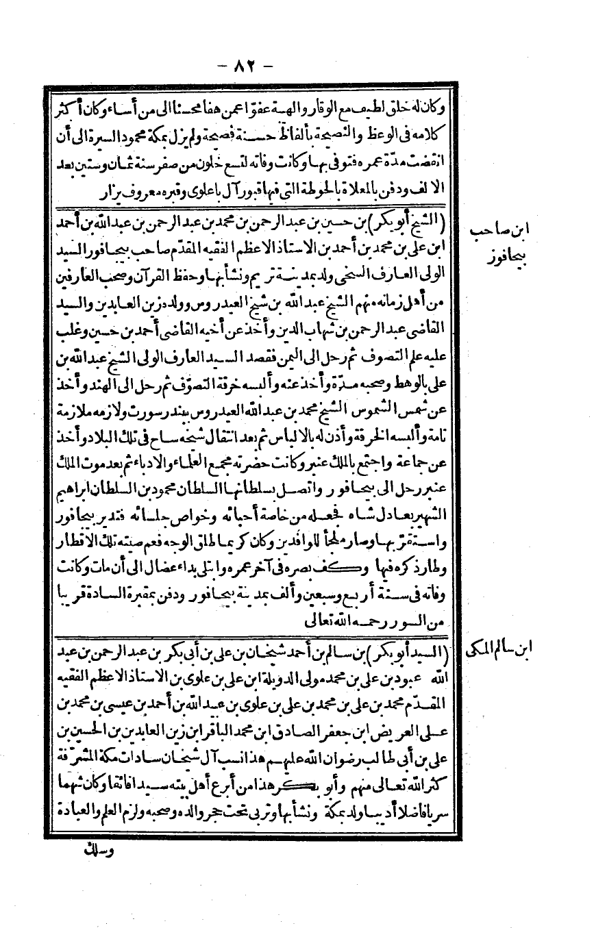 الشَّيْخ أَبُو بكر بن حُسَيْن بن عبد الرَّحْمَن بن مُحَمَّد بن عبد الرَّحْمَن بن عبد الله بن أَحْمد ابْن عَليّ بن مُحَمَّد بن أَحْمد بن الْأُسْتَاذ الْأَعْظَم الْفَقِيه الْمُقدم صَاحب بيجافور السَّيِّد الْوَلِيّ الْعَارِف السخي ولد بِمَدِينَة تريم وَنَشَأ بهَا وَحفظ الْقُرْآن وَصَحب العارفين من أهل زَمَانه مِنْهُم الشَّيْخ عبد الله بن شيخ العيدروس وَلَده زين العابدين وَالسَّيِّد القَاضِي عبد الرَّحْمَن بن شهَاب الدّين وَأخذ عَن أَخِيه القَاضِي أَحْمد بن حُسَيْن وَغلب عَلَيْهِ علم التصوف ثمَّ رَحل إِلَى الْيمن فقصد السَّيِّد الْعَارِف الْوَلِيّ الشَّيْخ عبد الله بن عَليّ بالوهط وَصَحبه مُدَّة وَأخذ عَنهُ وَألبسهُ خرقَة التصوف ثمَّ رَحل إِلَى الْهِنْد وَأخذ عَن شمس الشموس الشيح مُحَمَّد بن عبد الله العيدروس ببند سورت ولازمه مُلَازمَة تَامَّة وَألبسهُ الْخِرْقَة وَأذن لَهُ بالإلباس ثمَّ بعد انْتِقَال شَيْخه ساح فِي تِلْكَ الْبِلَاد واخذ عَن جمَاعَة وَاجْتمعَ بِالْملكِ عنبر وَكَانَت حَضرته مجمع الْعلمَاء والأدباء ثمَّ بعد موت الْملك عنبر رَحل إِلَى بيجافور واتصل بسلطانها السُّلْطَان مَحْمُود بن السُّلْطَان إِبْرَاهِيم الشهير بعادل شاه فَجعله من خَاصَّة أحبائه وخواص جُلَسَائِهِ فتدير بيجافور وَاسْتقر بهَا وَصَارَ ملْجأ للوافدين وَكَانَ كَرِيمًا طلق الْوَجْه فَعم صيته تِلْكَ الأقطار وطار ذكره فِيهَا وكف بَصَره فِي آخر عمره وابتلى بداء عضال إِلَى أَن مَاتَ وَكَانَت وَفَاته سنة أَربع وَسبعين والف بِمَدِينَة بيجافور وَدفن بمقبرة السَّادة قَرِيبا من السُّور رَحمَه الله تَعَالَى