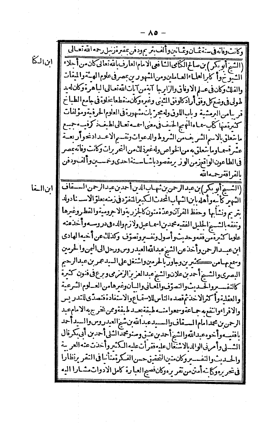 الشَّيْخ أَبُو بكر بن عبد الرَّحْمَن بن شهَاب الدّين أَحْمد بن عبد الرَّحْمَن السقاف الشهير كأبيه وَأَهله بِابْن الشهَاب الْمُحدث الْكَبِير المتفرد فِي زَمَنه بعلو الْإِسْنَاد ولد بتريم وَنَشَأ بهَا وَحفظ الْقُرْآن وعدة متون كالجزرية والأجرومية والقطر وَغَيرهَا وتفقه بالشيخ الْجَلِيل الْفَقِيه مُحَمَّد بن إِسْمَاعِيل ولازم وَالِده فِي دروسه وَأخذ عَنهُ علوما كَثِيرَة من فقه وَحَدِيث وأصول وَتَفْسِير وتصوف وَكَذَلِكَ عَن أَخِيه الْهَادِي ابْن عبد الرَّحْمَن وَأخذ عَن الشَّيْخ عبد الله العيدروس ورحل إِلَى الْيمن والحرمين وَسمع بهَا من كثيرين وجاور بالحرمين واشتغل على السَّيِّد عمر بن عبد الرَّحِيم الْبَصْرِيّ وَالشَّيْخ أَحْمد بن عَلان وَالشَّيْخ عبد الْعَزِيز الزمزمي وبرع فِي فنون كَثِيرَة كالتفسير والْحَدِيث والتصوف والمعاني وَالْبَيَان وَغَيرهَا من الْعُلُوم الشَّرْعِيَّة والعقلية وَأكْثر الْأَخْذ ثمَّ قَصده النَّاس للإستمتاع والإستفادة فتصدى للتدريس والإقراء وانتفع بِهِ جمَاعَة وسمعوا مِنْهُ طبقَة بعد طبقَة وَمِمَّنْ تخرج بِهِ الإِمَام عبد الرَّحْمَن بن مُحَمَّد إِمَام السقاف وَالسَّيِّد عبد الله بن شيخ العيدروس وَالسَّيِّد أَحْمد بافقيه وَأَخُوهُ عبد الله وَالشَّيْخ أَحْمد بن عَتيق وصنو مُحَمَّد الشلي أَحْمد بن أبي بكر قَالَ الشلي وَأَمرَنِي الْوَالِد بالإشتغال عَلَيْهِ فَقَرَأت عَلَيْهِ الْكثير وَأخذت عَنهُ الْعَرَبيَّة والْحَدِيث وَالتَّفْسِير وَكَانَ متين التَّحْقِيق حسن الْفِكر متأنيا فِي التَّقْرِير نظارا فِي تحريرة وكتابته أمتن من تقريرة وَكَانَ فصيح الْعبارَة كَامِل الأدوات مشارا إِلَيْهِ
