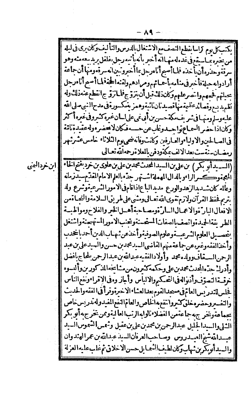 السَّيِّد أَبُو بكر بن عَليّ بن السَّيِّد الْمُحدث مُحَمَّد بن عَليّ بن علوي بن خرد بِفَتْح الْخَاء الْمُعْجَمَة وَكسر الرَّاء وبالدال الْمُهْملَة اشْتهر جده بِالْعلمِ الإِمَام الْمُقدم سيد زَمَانه وعالمه كَانَ شَدِيد الزّهْد والورع مديد الباع إِذا قَامَ فِي الْأُمُور الشَّرْعِيَّة وَشرع ولد بتريم فحفظ الْقُرْآن ولازم تقوى الله تَعَالَى وَمَشى على طَرِيق السَّلامَة والنجاة من الْأَفْعَال البارة والأعمال السارة ومصاحبة أهل الْخَيْر والفلاح ومواظبة الطَّرِيقَة الحميدة واتصف بِالصِّفَاتِ المستحسنة وتجنب الْأُمُور المستهجنة واشتغل بتحصيل الْعُلُوم الشَّرْعِيَّة وعلوم الصُّوفِيَّة وَأخذ عَن شهَاب الدّين أَحْمد باخجدب وَأخذ الْفِقْه وَغَيره عَن جمَاعَة مِنْهُم القَاضِي السَّيِّد مُحَمَّد بن حسن وَالسَّيِّد عَليّ بن عبد الرَّحْمَن السقاف وَولده مُحَمَّد وَأَوْلَاد الْفَقِيه عبد الله بن عبد الرَّحْمَن بلحاج بِأَفْضَل وَأدْركَ جده الْمُحدث مُحَمَّد بن عَليّ وَحكمه كَثِيرُونَ من مشايخه الْمَذْكُورين وألبسوه خرقَة التصوف وأدنوا لَهُ فِي التَّحْكِيم والالباس وأجازوه فِي الإقراء ونفع النَّاس فَجَلَسَ للتدريس الْعَام فِي مَسْجِد الْقَوْم بعد الْعشَاء الْأَخِيرَة وَقَرَأَ فِي الْفِقْه والْحَدِيث وَالتَّفْسِير وحضره خلق كثير وانتفع بِهِ الْخَاص وَالْعَام النَّفْع الْمُفِيد لَهُ تدريس خَاص بِجَمَاعَة وَتخرج بِهِ جمَاعَة من الْفُضَلَاء نالوا بِهِ الرتب الْعَالِيَة وَمِمَّنْ تخرج بِهِ أَبُو بكر الشلي وَالسَّيِّد الْجَلِيل عبد الرَّحْمَن بن مُحَمَّد بن عَليّ بن عقيل وشمس الشموس السَّيِّد عبد الله شيخ العيدروس وَصَاحب الْعرْفَان السَّيِّد عبد الله بن عمر الهندوان وَالسَّيِّد أَبُو بكر بن شهَاب وَكَانَ لطيف الشمايل حسن الْأَخْلَاق ثمَّ غلب عَلَيْهِ الْعُزْلَة