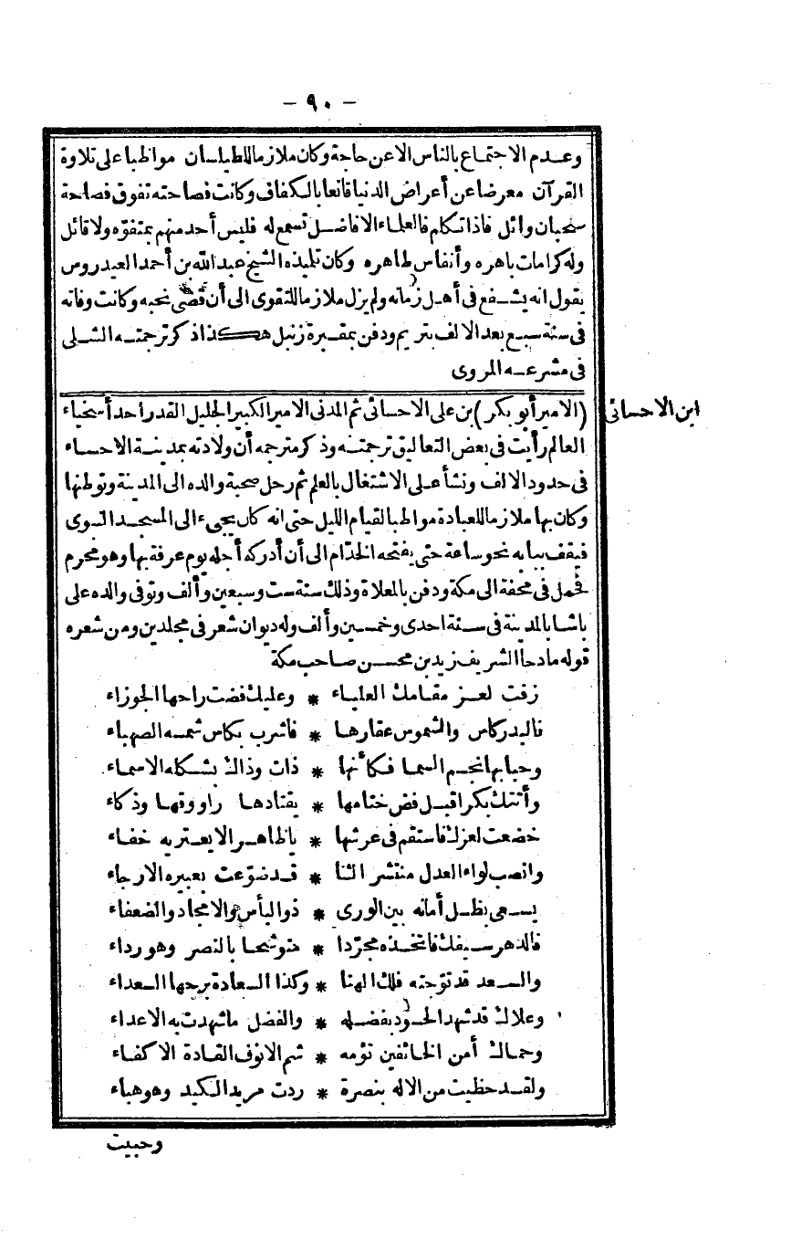 الْأَمِير أَبُو بكر بن عَليّ الإحسائي ثمَّ الْمدنِي الْأَمِير الْكَبِير الْجَلِيل الْقدر أحد أسخياء الْعَالم رَأَيْت فِي بعض التَّعَالِيق تَرْجَمته وَذكر مترجمه أَن وِلَادَته بِمَدِينَة الأحساء فِي حُدُود الْألف وَنَشَأ على الِاشْتِغَال بِالْعلمِ ثمَّ رَحل صُحْبَة وَالِده إِلَى الْمَدِينَة وتوطنها وَكَانَ بهَا ملازماً لِلْعِبَادَةِ مواظباً لقِيَام اللَّيْل حَتَّى إِنَّه كَانَ يَجِيء إِلَى الْمَسْجِد النَّبَوِيّ فيقف بِبَابِهِ نَحْو سَاعَة حَتَّى يَفْتَحهُ الخدّام إِلَى أَن أدْركهُ أَجله يَوْم عَرَفَة بهَا وَهُوَ محرم فَحمل فِي محفة إِلَى مَكَّة وَدفن بالمعلاة وَذَلِكَ سنة سِتّ وَسبعين وَألف وَتُوفِّي وَالِده عَليّ باشا بِالْمَدِينَةِ فِي سنة إِحْدَى وَخمسين وَألف وَله ديوَان شعر فِي مجلدين وَمن شعره قَوْله مادحاً الشريف زيد بن محسن صَاحب مَكَّة