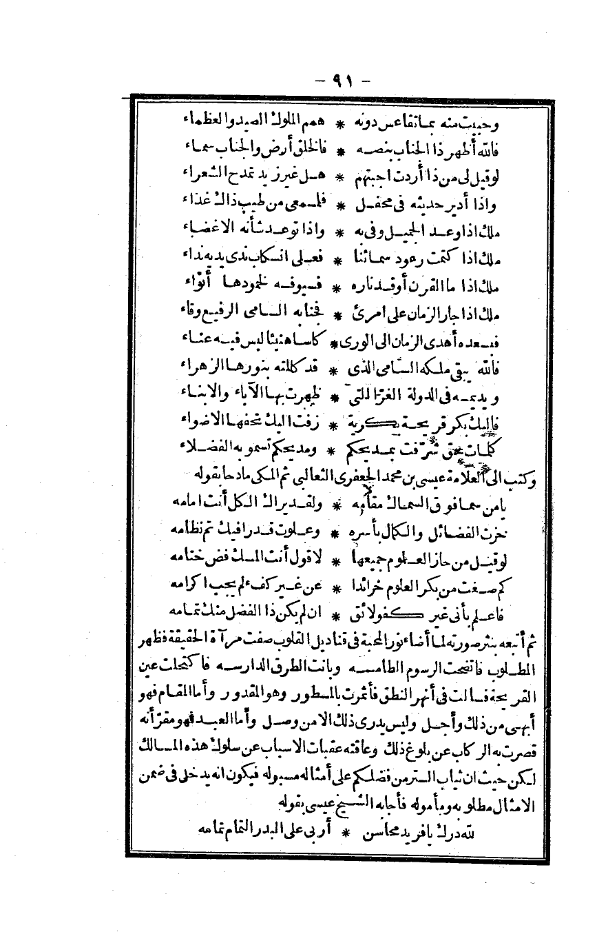 ثمَّ أتبعه بنثر صورته لما أَضَاء نور الْمحبَّة فِي قناديل الْقُلُوب صفت مرْآة الْحَقِيقَة فَظهر الْمَطْلُوب فاتضحت الرسوم الطامسة وَبَانَتْ الطّرق الدارسة فاكتحلت عين القريحة فسالت فِي أنهر النُّطْق فأثمرت بالمسطور وَهُوَ الْمَقْدُور وَأما الْمقَام فَهُوَ أبهى من ذَلِك وَأجل وَلَيْسَ يدرى ذَلِك إِلَّا من وصل وَأما العَبْد فَهُوَ مقرّ أَنه قصرت بِهِ الركاب عَن بُلُوغ ذَلِك وعاقته عقبات الْأَسْبَاب عَن سلوك هَذِه المسالك لَكِن حَيْثُ أَن ثِيَاب السّتْر من فَضلكُمْ على أَمْثَاله مسبولة فَيكون أَنه يدْخل فِي ضمن الْأَمْثَال مَطْلُوبه ومأموله فَأَجَابَهُ الشَّيْخ عِيسَى بقوله