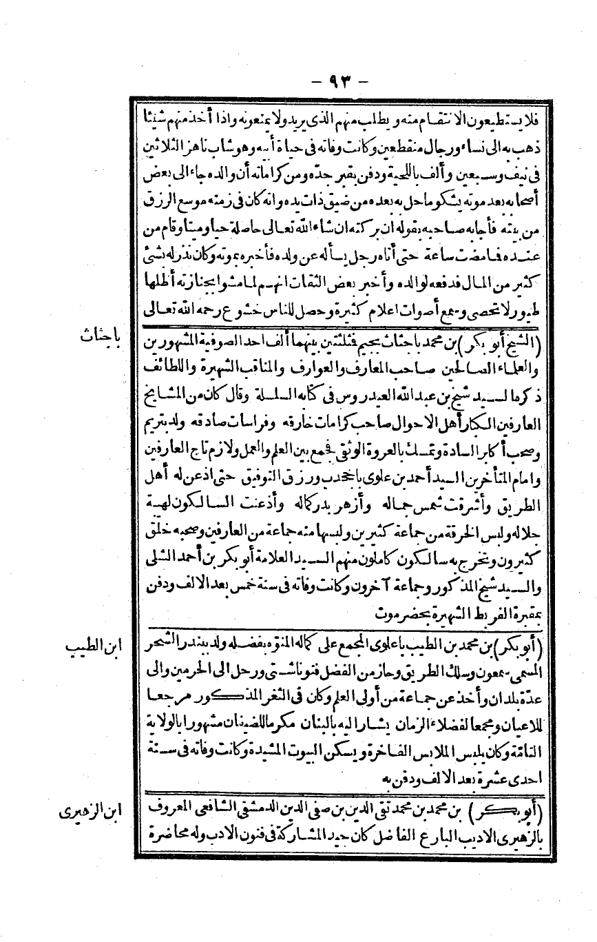 فَلَا يَسْتَطِيعُونَ الانتقام مِنْهُ وَيطْلب مِنْهُم الَّذِي يُرِيد وَلَا يمنعونه وَإِذا أَخذ مِنْهُم شَيْئا ذهب بِهِ إِلَى نسَاء وَرِجَال منقطعين وَكَانَت وَفَاته فِي حَيَاة أَبِيه وَهُوَ شَاب ناهز الثَّلَاثِينَ فِي نَيف وَسبعين وَألف باللحية وَدفن بِقَبْر جده وَمن كراماته أَن وَالِده جَاءَ إِلَى بعض أَصْحَابه بعد مَوته يشكو مَا حل بِهِ بعده من ضيق ذَات يَده وَإنَّهُ كَانَ فِي زَمَنه موسع الرزق من بَيته فَأَجَابَهُ صَاحبه بقوله إِن بركته إِن شَاءَ الله تَعَالَى حَاصِلَة حَيا وَمَيتًا وَقَامَ من عِنْده فَمَا مَضَت سَاعَة حَتَّى أَتَاهُ رجل يسْأَله عَن وَلَده فَأخْبرهُ بِمَوْتِهِ وَكَانَ نذر لَهُ بِشَيْء كثير من المَال فَدفعهُ لوالده وَأخْبر بعض الثِّقَات أَنهم لما مَشوا بجنازته أظلها طيور لَا تحصى وَسمع أصوات أَعْلَام كَثِيرَة وَحصل للنَّاس خشوع رَحمَه الله تَعَالَى