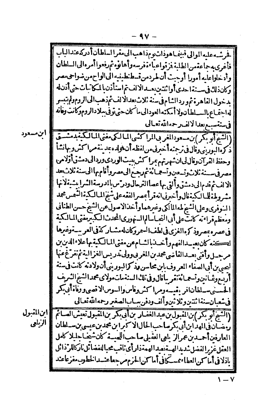 الشَّيْخ أَبُو بكر بن مَسْعُود المغربي المراكشي الْمَالِكِي مفتي الْمَالِكِيَّة بِدِمَشْق ذكره البوريني وَقَالَ فِي تَرْجَمته أَخْبرنِي من لَفظه أَن مولده بِمَدِينَة مراكش وَبهَا نَشأ وَحفظ الْقُرْآن وَقَالَ لي أَن شهرتهم بمراكش بِبَيْت الوردي ورد إِلَى دمشق أَولا من مصر فِي سنة ثَلَاث وَتِسْعين وَتِسْعمِائَة ثمَّ رَجَعَ إِلَى مصر وَأقَام بهَا إِلَى سنة ثَلَاث بعد الْألف ثمَّ قدم إِلَى دمشق وَألقى بهَا عَصا الترحال ودرس بِالْمَدْرَسَةِ الشرابيشية لِأَنَّهَا مَشْرُوطَة للمالكية قَالَ وَأَخْبرنِي أَنه قَرَأَ بِمصْر الْفِقْه على شيخ الْمَالِكِيَّة الشَّمْس مُحَمَّد البنوفري وعَلى الشَّيْخ طه الْمَالِكِي وَغَيرهمَا وَأخذ الْأُصُول عَن الشَّيْخ حسن الطناني ومعظم قِرَاءَته كَانَت على أبي النجا سَالم السنهوري الْمُحدث الْكَبِير مفتي الْمَالِكِيَّة فِي عصره بِمصْر وَذكره الْغَزِّي فِي لطف السمر وَكَانَ لَهُ مُشَاركَة فِي الْعَرَبيَّة وَغَيرهَا لكنه كَانَ بعيد الْفَهم وَأخذ بِالشَّام عَن مفتي الْمَالِكِيَّة بهَا عَلَاء الدّين بن مرجل وَأفْتى بعد القَاضِي مُحَمَّد بن المغربي وَولي تدريس الغزالية ثمَّ تفرغ عَنْهَا ليحيى بن أبي الصفاء الْمَعْرُوف بِابْن محَاسِن وَذكر البوريني أَن وِلَادَته كَانَ فِي سنة أَربع وَثَمَانِينَ وَتِسْعمِائَة تَقْرِيبًا قَالَ وَفِي تِلْكَ السّنة مَاتَ مولَايَ مُحَمَّد الشَّيْخ الشريف الحسني سُلْطَان إفريقية ومراكش وفاس والسوس والأقصى ووفاة أبي بكر فِي شعْبَان سنة اثْنَتَيْنِ وَثَلَاثِينَ وَألف وَدفن بِبَاب الصَّغِير رَحمَه الله تَعَالَى
