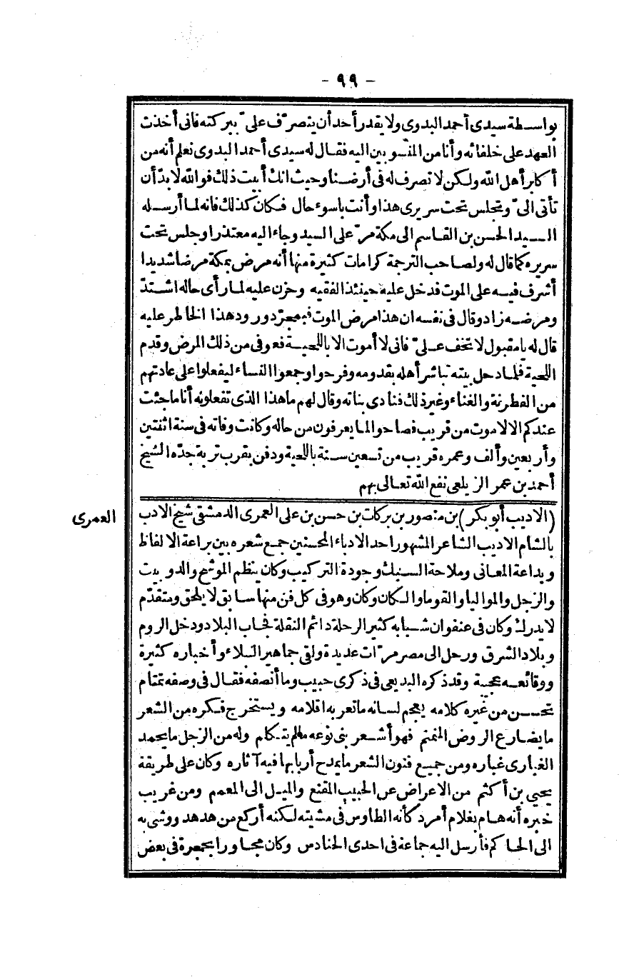 الأديب أَبُو بكر بن مَنْصُور بن بَرَكَات بن حسن بن عَليّ الْعمريّ الدِّمَشْقِي شيخ الْأَدَب بِالشَّام الأديب الشَّاعِر الْمَشْهُور أحد الأدباء الْمُحْسِنِينَ جمع شعره بَين براعة الْأَلْفَاظ وبداعة الْمعَانِي وملاحة السبك وجودة التَّرْكِيب وَكَانَ ينظم الموشح وَالِد وَبَيت والزجل والمواليا والقوما والكان وَكَانَ وَهُوَ فِي كل فن مِنْهَا سَابق لَا يلْحق ومتقدم لَا يدْرك وَكَانَ فِي عنفوان شبابه كثير الرحلة دَائِم النقلَة فجاب الْبِلَاد وَدخل الرّوم وبلاد الشرق ورحل إِلَى مصر مَرَّات عديدة وَلَقي جَمَاهِير النبلاء وأخباره كَثِيرَة وَوَقَائعه عَجِيبَة وَقد ذكره البديعي فِي ذكرى حبيب وَمَا انصفه فَقَالَ فِي وَصفه تمْتَام تحسن من غَيره كَلَامه يعجم لِسَانه مَا تعربه أقلامه ويستخرج فكره من الشّعْر مَا يضارع الرَّوْض المنمنم فَهُوَ أشعر بني نَوعه مَا لم يتَكَلَّم وَله من الزجل مَا يحمد الغباري غباره وَمن جَمِيع فنون الشّعْر مَا يمدح أَرْبَابهَا فِيهِ آثاره وَكَانَ على طَريقَة يحيى بن أَكْثَم من الْأَعْرَاض عَن الحبيب الْمقنع والميل إِلَى المعمم وَمن غَرِيب خَبره أَنه هام بِغُلَام أَمْرَد كَأَنَّهُ الطاوس فِي مشيته لكنه أركع من هدهد ووشي بِهِ إِلَى الْحَاكِم فَأرْسل إِلَيْهِ جمَاعَة فِي إِحْدَى الحنادس وَكَانَ مجاوراً بحجرة فِي بعض