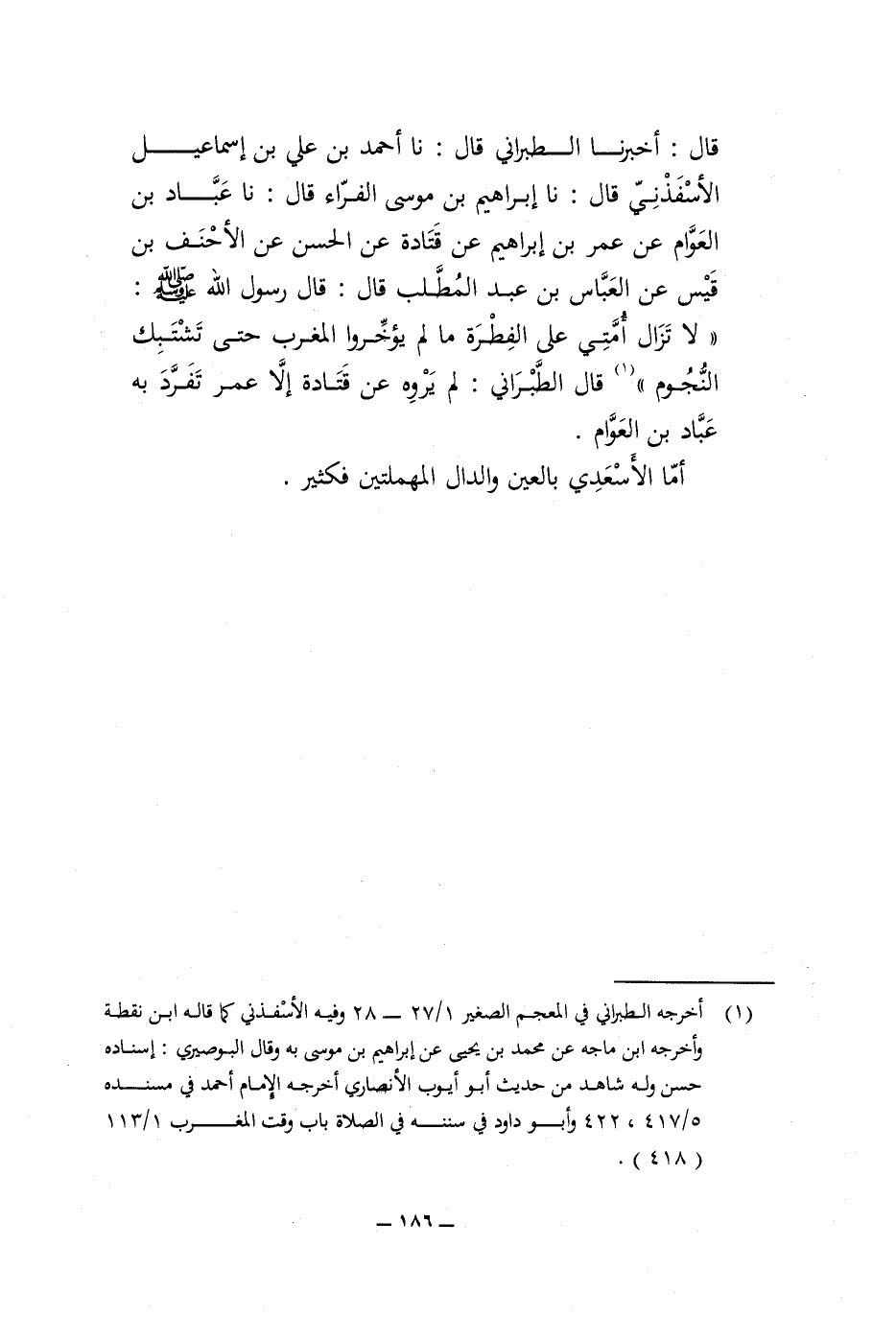 قَالَ أخبرنَا الطَّبَرَانِيّ قَالَ نَا أَحْمد بن عَليّ بن إِسْمَاعِيل الأسفذني قَالَ نَا إِبْرَاهِيم بن مُوسَى الْفراء قَالَ نَا عباد بن الْعَوام عَن عمر بن إِبْرَاهِيم عَن قَتَادَة عَن الْحسن عَن الْأَحْنَف بن قيس عَن الْعَبَّاس بن عبد الْمطلب قَالَ قَالَ رَسُول الله صلى الله عَلَيْهِ وَسلم لَا تزَال أمتِي على الْفطْرَة مَا لم يؤخروا الْمغرب حَتَّى تشتبك النُّجُوم قَالَ الطَّبَرَانِيّ لم يروه عَن قَتَادَة إِلَّا عمر تفرد بِهِ عباد بن الْعَوام