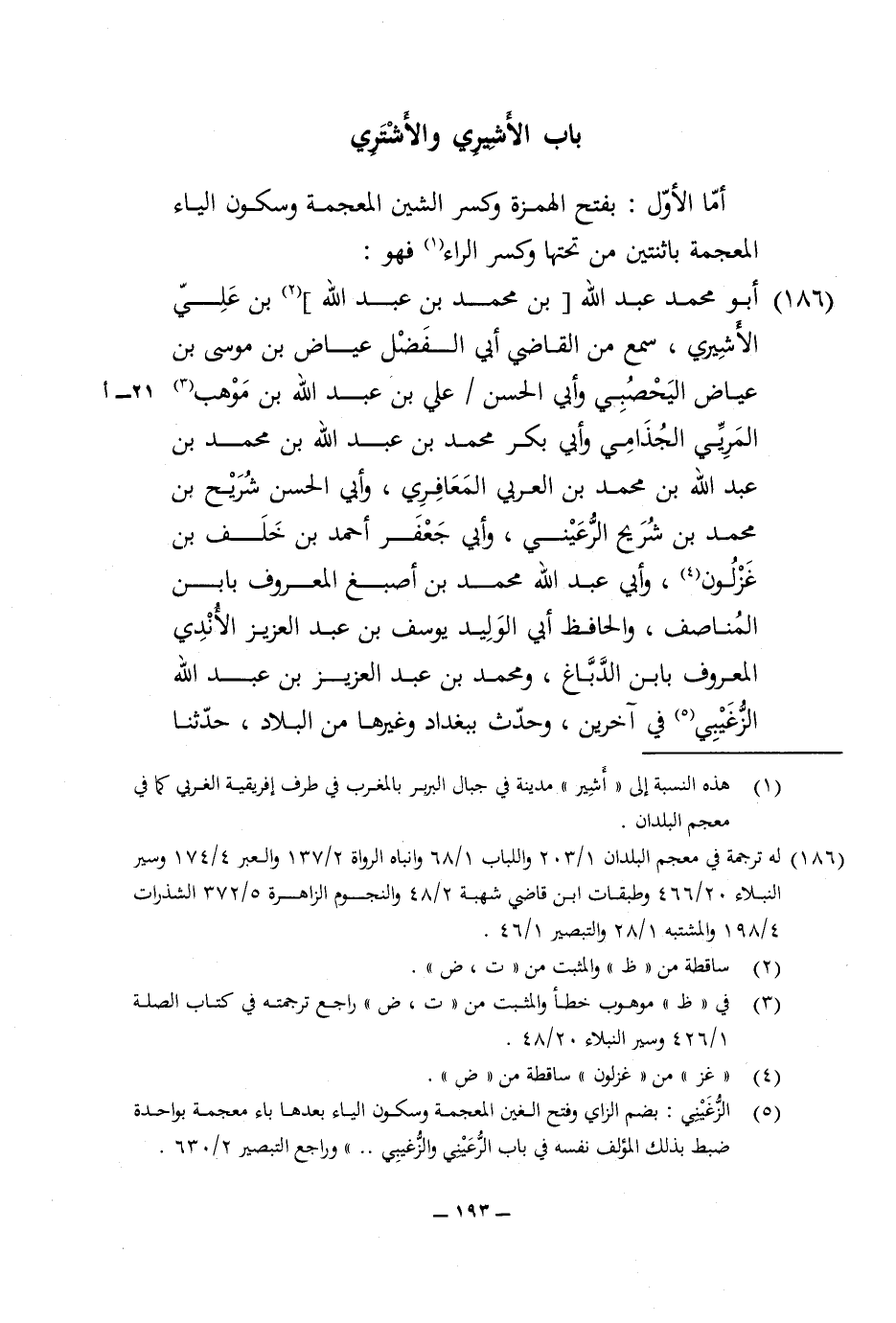 186 - أَبُو مُحَمَّد عبد الله بن مُحَمَّد بن عبد الله بن عَليّ الأشيري سمع من القَاضِي أبي الْفضل عِيَاض بن مُوسَى بن عِيَاض الْيحصبِي وَأبي الْحسن عَليّ بن عبد الله بن موهب المريي الجذامي وابي بكر مُحَمَّد بن عبد الله بن مُحَمَّد بن عبد الله بن مُحَمَّد بن الْعَرَبِيّ الْمعَافِرِي وَأبي الْحسن شُرَيْح بن مُحَمَّد بن شُرَيْح الرعيني وابي جَعْفَر أَحْمد بن خلف بن غزلون وَأبي عبد الله مُحَمَّد بن أصبغ الْمَعْرُوف بِابْن المناصف والحافظ أبي الْوَلِيد يُوسُف بن عبد الْعَزِيز الأندي الْمَعْرُوف بِابْن الدّباغ وَمُحَمّد بن عبد الْعَزِيز بن عبد الله الزغيبي فِي آخَرين وَحدث بِبَغْدَاد وَغَيرهَا من الْبِلَاد حَدثنَا