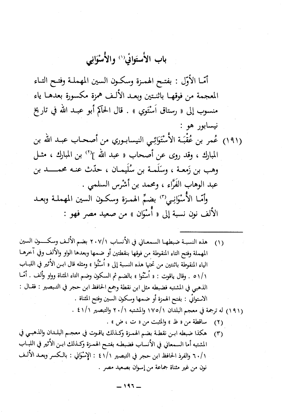 191 - عمر بن عقبَة الأستوائي النَّيْسَابُورِي من أَصْحَاب عبد الله بن الْمُبَارك وَقد روى عَن أَصْحَاب عبد الله بن الْمُبَارك مثل وهب بن زَمعَة وَسَلَمَة بن سُلَيْمَان حدث عَنهُ مُحَمَّد بن عبد الْوَهَّاب الْفراء وَمُحَمّد بن أَشْرَس السّلمِيّ