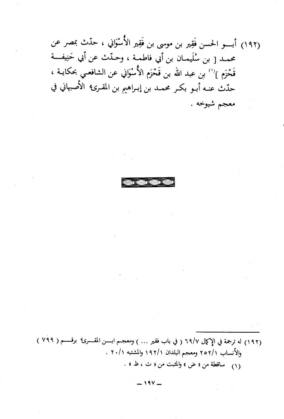 192 - أَبُو الْحسن فقيربن مُوسَى بن فَقير الأسواني حدث بِمصْر عَن مُحَمَّد بن سُلَيْمَان بن أبي فَاطِمَة وَحدث عَن ابي حنيفَة قحزم بن عبد الله بن قحزم الأسواني عَن الشَّافِعِي بحكاية حدث عَنهُ أَبُو بكر مُحَمَّد بن إِبْرَاهِيم بن المقرىء الْأَصْبَهَانِيّ فِي مُعْجم شُيُوخه