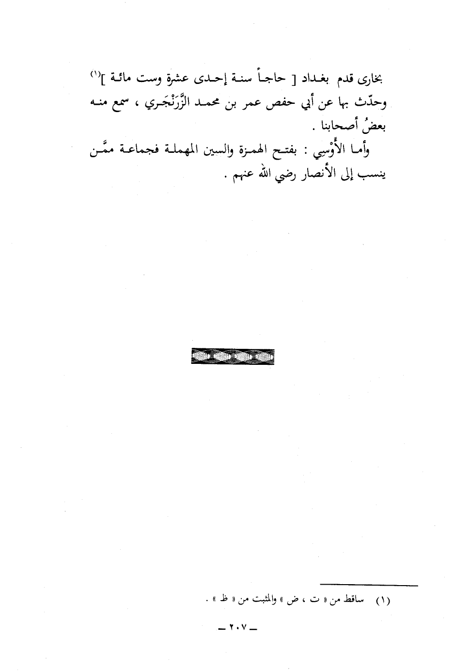 وَأما الأوسي بِفَتْح الْهمزَة وَالسِّين الْمُهْملَة فجماعة مِمَّن ينْسب إِلَى الْأَنْصَار رَضِي الله عَنْهُم