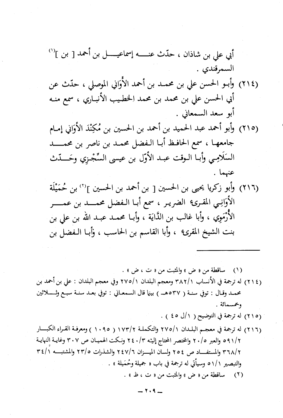 214 - وَأَبُو الْحسن عَليّ بن مُحَمَّد بن أَحْمد الْأَوَانِي الْموصِلِي حدث عَن أبي الْحسن عَليّ بن مُحَمَّد بن مُحَمَّد الْخَطِيب الْأَنْبَارِي سمع مِنْهُ أَبُو سعد السَّمْعَانِيّ