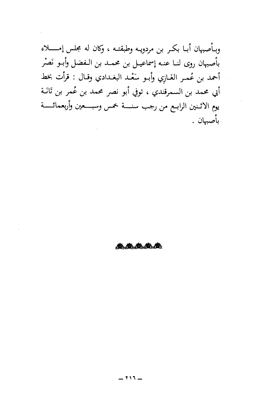 وبأصبهان أَبَا بكر بن مرْدَوَيْه وطبقته وَكَانَ لَهُ مجْلِس إملاء بأصبهان روى لنا عَنهُ إِسْمَاعِيل بن مُحَمَّد بن الْفضل وَأَبُو نصر أَحْمد بن عمر الْغَازِي وَأَبُو سعد الْبَغْدَادِيّ وَقَالَ قَرَأت بِخَط أبي مُحَمَّد بن السَّمرقَنْدِي توفّي أَبُو نصر مُحَمَّد بن عمر بن تانة يَوْم الأثنين الرَّابِع من رَجَب سنة خمس وَسبعين وَأَرْبَعمِائَة بأصبهان