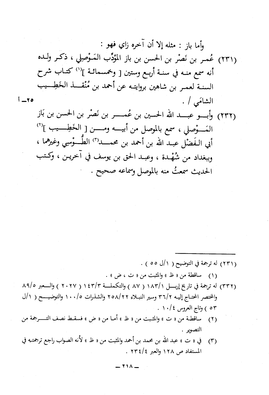 231 - عمر بن نصر بن الْحسن بن باز الْمُؤَدب الْموصِلِي ذكر وَلَده أَنه سمع مِنْهُ فِي سنة أَربع وَسِتِّينَ وَخَمْسمِائة كتاب شرح السّنة لعمر بن شاهين بروايته عَن أَحْمد بن منقذ الْخَطِيب الشَّامي