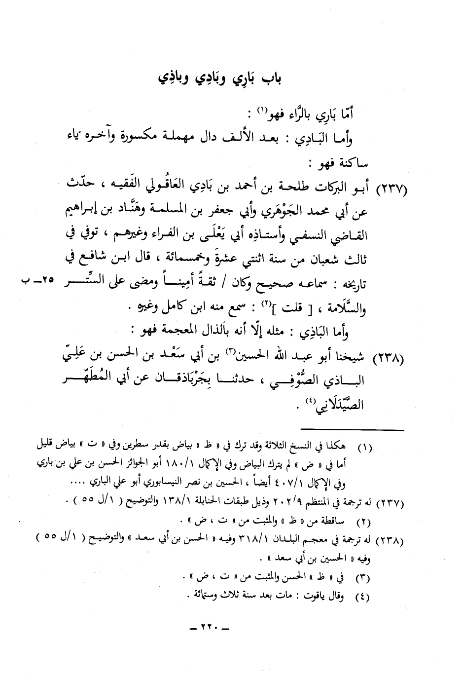 237 - أَبُو البركات طَلْحَة بن أَحْمد بن بَادِي العاقولي الْفَقِيه حدث عَن أبي مُحَمَّد الْجَوْهَرِي وَأبي جَعْفَر بن الْمسلمَة وهناد بن إِبْرَاهِيم القَاضِي النَّسَفِيّ وأستاذه أبي يعلى بن الْفراء وَغَيرهم توفّي فِي ثَالِث شعْبَان من سنة اثْنَتَيْ عشرَة وَخَمْسمِائة قَالَ ابْن شَافِع فِي تَارِيخه سَمَاعه صَحِيح وَكَانَ ثِقَة أَمينا وَمضى على السّتْر والسلامة قلت سمع مِنْهُ ابْن كَامِل وَغَيره