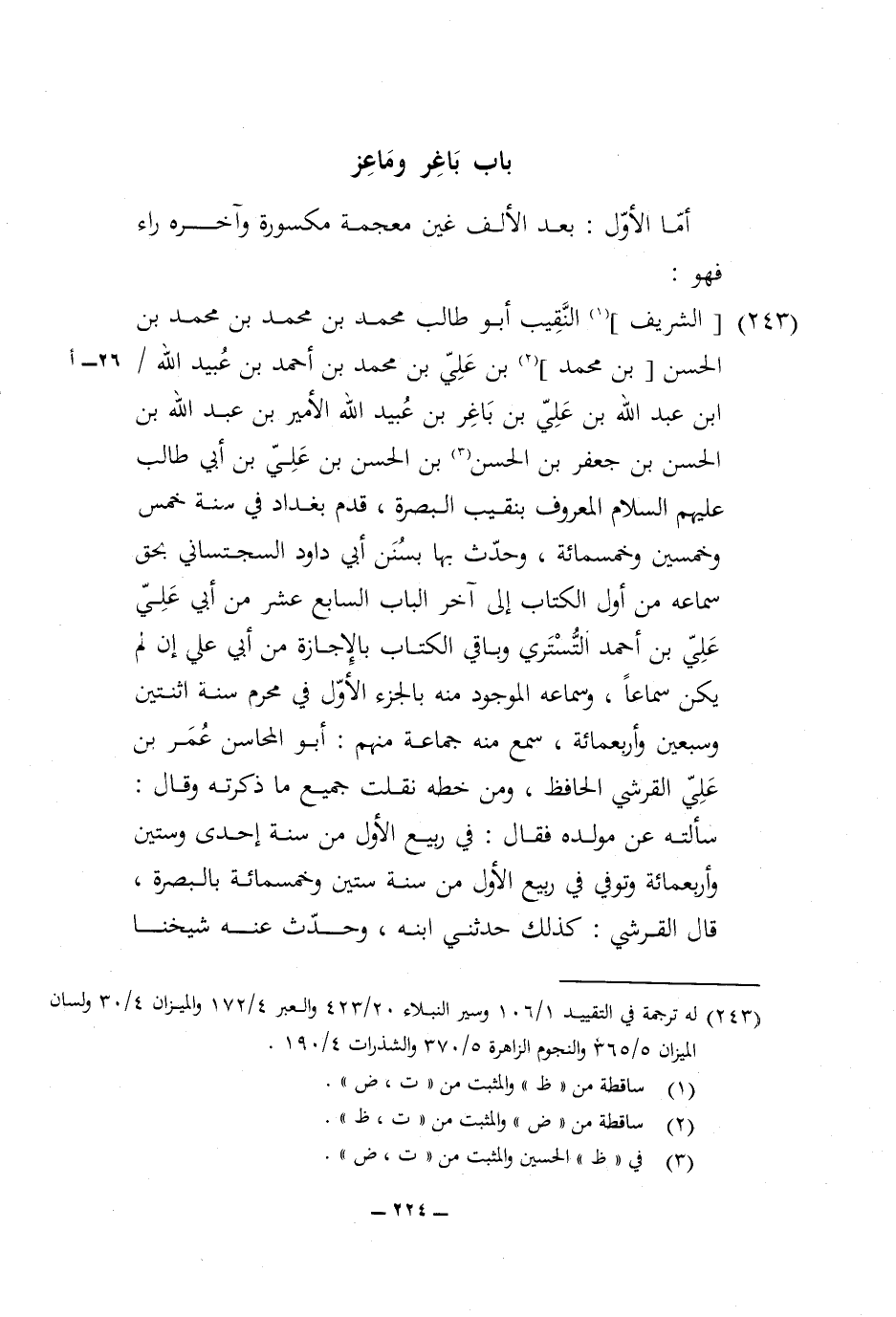 243 - الشريف النَّقِيب أَبُو طَالب مُحَمَّد بن مُحَمَّد بن مُحَمَّد بن الْحسن بن مُحَمَّد بن عَليّ بن مُحَمَّد بن أَحْمد بن عبيد الله ابْن عبد الله بن عَليّ بن باغر بن عبيد الله الْأَمِير بن عبد الله بن الْحسن بن جَعْفَر بن الْحسن بن الْحسن بن عَليّ بن أبي طَالب عَلَيْهِم السَّلَام الْمَعْرُوف بنقيب الْبَصْرَة قدم بَغْدَاد فِي سنة خمس وَخمسين وَخَمْسمِائة وَحدث بهَا بسنن أبي دَاوُد السجتساني بِحَق سَمَاعه من أول الْكتاب إِلَى آخر الْبَاب السَّابِع عشر من أبي عَليّ عَليّ بن أَحْمد التسترِي وَبَاقِي الْكتاب بِالْإِجَازَةِ من أبي عَليّ إِن لم يكن سَمَاعا وسماعه الْمَوْجُود مِنْهُ بالجزء الأول فِي محرم سنة اثْنَتَيْنِ وَسبعين وَأَرْبَعمِائَة سمع مِنْهُ جمَاعَة مِنْهُم أَبُو المحاسن عمر بن عَليّ الْقرشِي الْحَافِظ وَمن خطه نقلت جَمِيع مَا ذكرته وَقَالَ سَأَلته عَن مولده فَقَالَ فِي ربيع الأول من سنة إِحْدَى وَسِتِّينَ وَأَرْبَعمِائَة وَتُوفِّي فِي ربيع الأول من سنة سِتِّينَ وَخَمْسمِائة بِالْبَصْرَةِ قَالَ الْقرشِي كَذَلِك حَدثنِي ابْنه وَحدث عَنهُ شَيخنَا