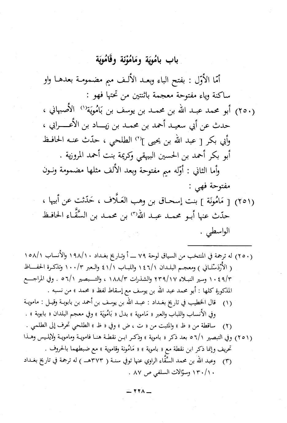 250 - ابو مُحَمَّد عبد الله بن مُحَمَّد بن يُوسُف بن باموية الْأَصْبَهَانِيّ حدث عَن أبي سعيد أَحْمد بن مُحَمَّد بن زِيَاد بن الْأَعرَابِي وَأبي بكر عبد الله بن يحيى الطلحي حدث عَنهُ الْحَافِظ أَبُو بكر احْمَد بن الْحُسَيْن الْبَيْهَقِيّ وكريمة بنت أَحْمد المروزية