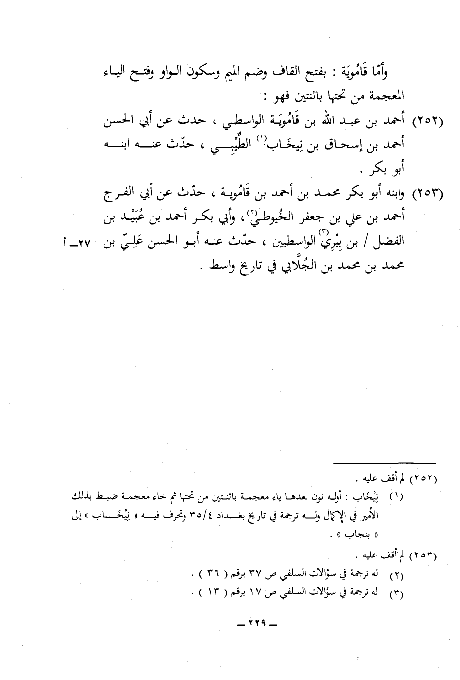 252 - أَحْمد بن عبد الله بن قاموية الوَاسِطِيّ حدث عَن أبي الْحسن أَحْمد بن إِسْحَاق بن نيخاب الطَّيِّبِيّ حدث عَنهُ ابْنه أَبُو بكر