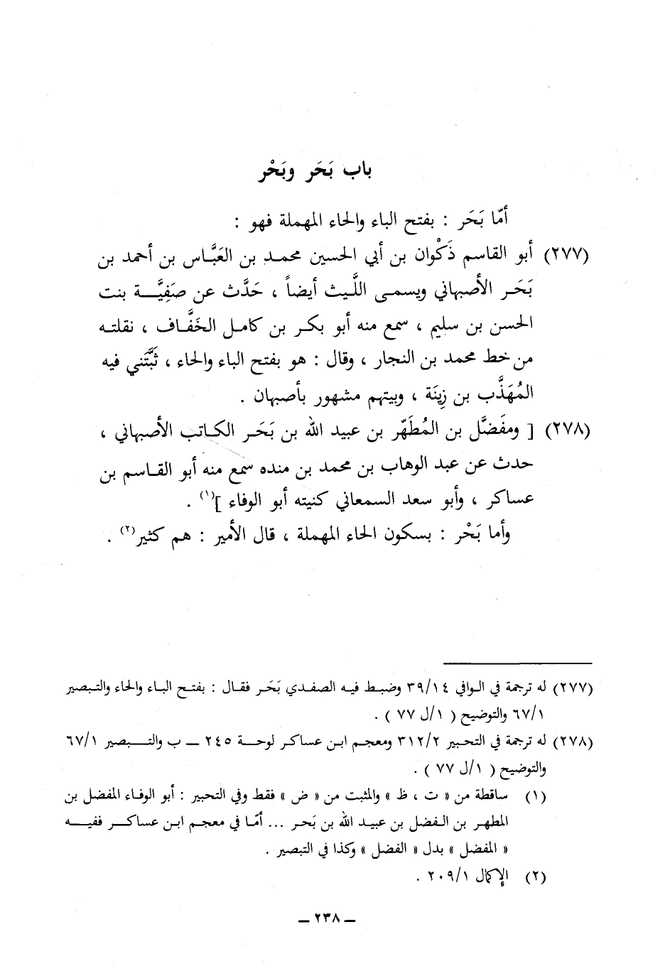 278 - ومفضل بن المطهر بن عبيد الله بن بَحر الْكَاتِب الْأَصْبَهَانِيّ حدث عَن عبد الوهاب بن مُحَمَّد بن مَنْدَه سمع مِنْهُ أَبُو الْقَاسِم بن عَسَاكِر وَأَبُو سعد السَّمْعَانِيّ كنيته أَبُو الْوَفَاء