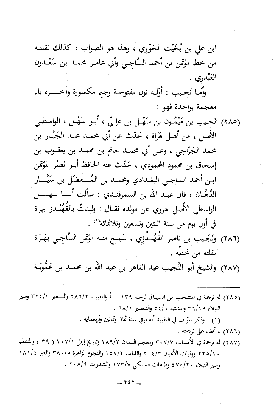 285 - نجيب بن مَيْمُون بن سهل بن عَليّ أَبُو سهل الوَاسِطِيّ الأَصْل من أهل هراة حدث عَن أبي مُحَمَّد عبد الْجَبَّار بن مُحَمَّد الجراحي وَعَن أبي مُحَمَّد حَاتِم بن مُحَمَّد بن يَعْقُوب بن إِسْحَاق بن مَحْمُود المحمودي حدث عَنهُ الْحَافِظ أَبُو نصر المؤتمن ابْن أَحْمد السَّاجِي الْبَغْدَادِيّ وَمُحَمّد بن الْمفضل بن سيار الدهان قَالَ عبد الله بن السَّمرقَنْدِي سَأَلت أَبَا سهل الوَاسِطِيّ الأَصْل الْهَرَوِيّ عَن مولده فَقَالَ ولدت بالقهندز بهراة فِي أول يَوْم من سنة اثْنَتَيْنِ وَتِسْعين وثلاثمائة