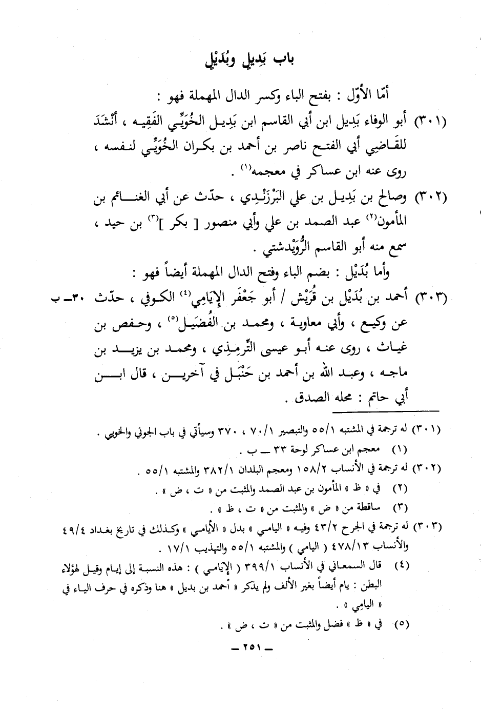 301 - أَبُو الْوَفَاء بديل بن أبي الْقَاسِم بن بديل الخويي الْفَقِيه أنْشد للْقَاضِي أبي الْفَتْح نَاصِر بن أَحْمد بن بكران الخويي لنَفسِهِ روى عَنهُ ابْن عَسَاكِر فِي مُعْجَمه