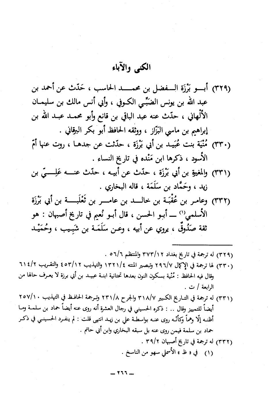 329 - أَبُو بَرزَة الْفضل بن مُحَمَّد الحاسب حدث عَن أَحْمد بن عبد الله بن يُونُس الضَّبِّيّ الْكُوفِي وابي أنس مَالك بن سُلَيْمَان الْأَلْهَانِي حدث عَنهُ عبد الْبَاقِي بن قَانِع وَأَبُو مُحَمَّد عبد الله بن إِبْرَاهِيم بن ماسي الْبَزَّاز وَوَثَّقَهُ الْحَافِظ أَبُو بكر البرقاني