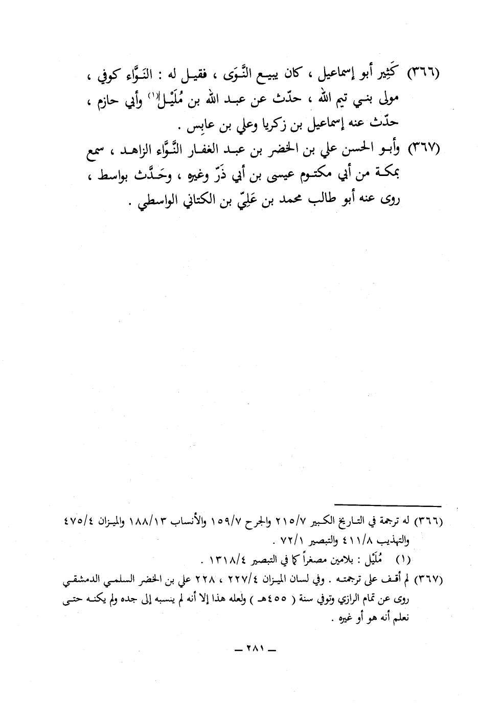 366 - كثير أَبُو إِسْمَاعِيل كَانَ يَبِيع النَّوَى فَقيل لَهُ النواء كُوفِي مولى بني تيم الله حدث عَن عبد الله بن مليل وَأبي حَازِم حدث عَنهُ إِسْمَاعِيل بن زَكَرِيَّا وَعلي بن عَابس