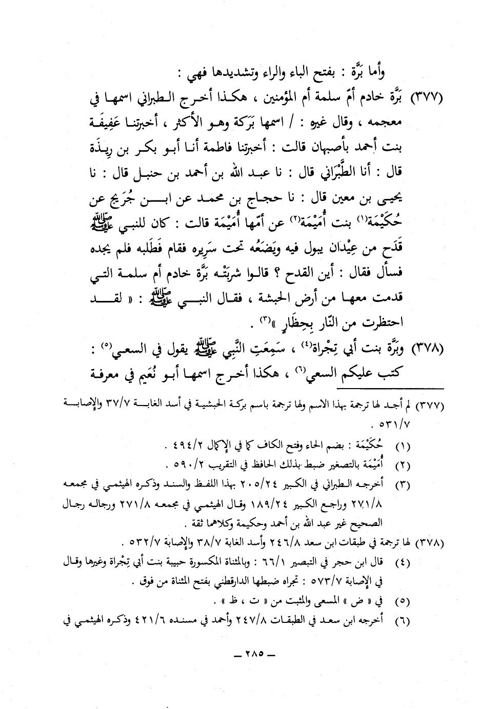 377 - برة خَادِم أم سَلمَة أم الْمُؤمنِينَ هَكَذَا أخرج الطَّبَرَانِيّ اسْمهَا فِي مُعْجَمه وَقَالَ غَيره اسْمهَا بركَة وَهُوَ الْأَكْثَر أخبرتنا عفيفة بنت أَحْمد بأصبهان قَالَت أخبرتنا فَاطِمَة أَنا أَبُو بكر بن ريذة قَالَ أَنا الطَّبَرَانِيّ قَالَ نَا عبد الله بن أَحْمد بن حَنْبَل قَالَ نَا يحيى بن معِين قَالَ نَا حجاج بن مُحَمَّد بن ابْن جريج عَن حكيمة بنت اميمة عَن أمهَا أُمَيْمَة قَالَت كَانَ للنَّبِي صلى الله عَلَيْهِ وَسلم قدح من عيدَان يَبُول فِيهِ ويضعه تَحت سَرِيره فَقَامَ فَطَلَبه فَلم يجده فَسَأَلَ فَقَالَ أَيْن الْقدح قَالُوا شربته برة خَادِم ام سَلمَة الَّتِي قدمت مَعهَا من أَرض الْحَبَشَة فَقَالَ النَّبِي صلى الله عَلَيْهِ وَسلم لقد احتظرت من النَّار بحظار