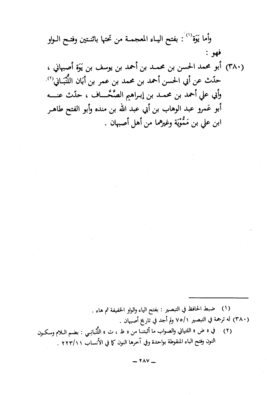 380 - أَبُو مُحَمَّد الْحسن بن مُحَمَّد بن أَحْمد بن يُوسُف بن يوة أصبهاني حدث عَن أبي الْحسن أَحْمد بن مُحَمَّد بن عمر بن أبان اللنباني وَأبي عَليّ أَحْمد بن مُحَمَّد بن إِبْرَاهِيم الصحاف حدث عَنهُ أَبُو عَمْرو عبد الْوَهَّاب بن أبي عبد الله بن مَنْدَه وَأَبُو الْفَتْح طَاهِر بن عَليّ بن مموية وَغَيرهمَا من أهل أَصْبَهَان