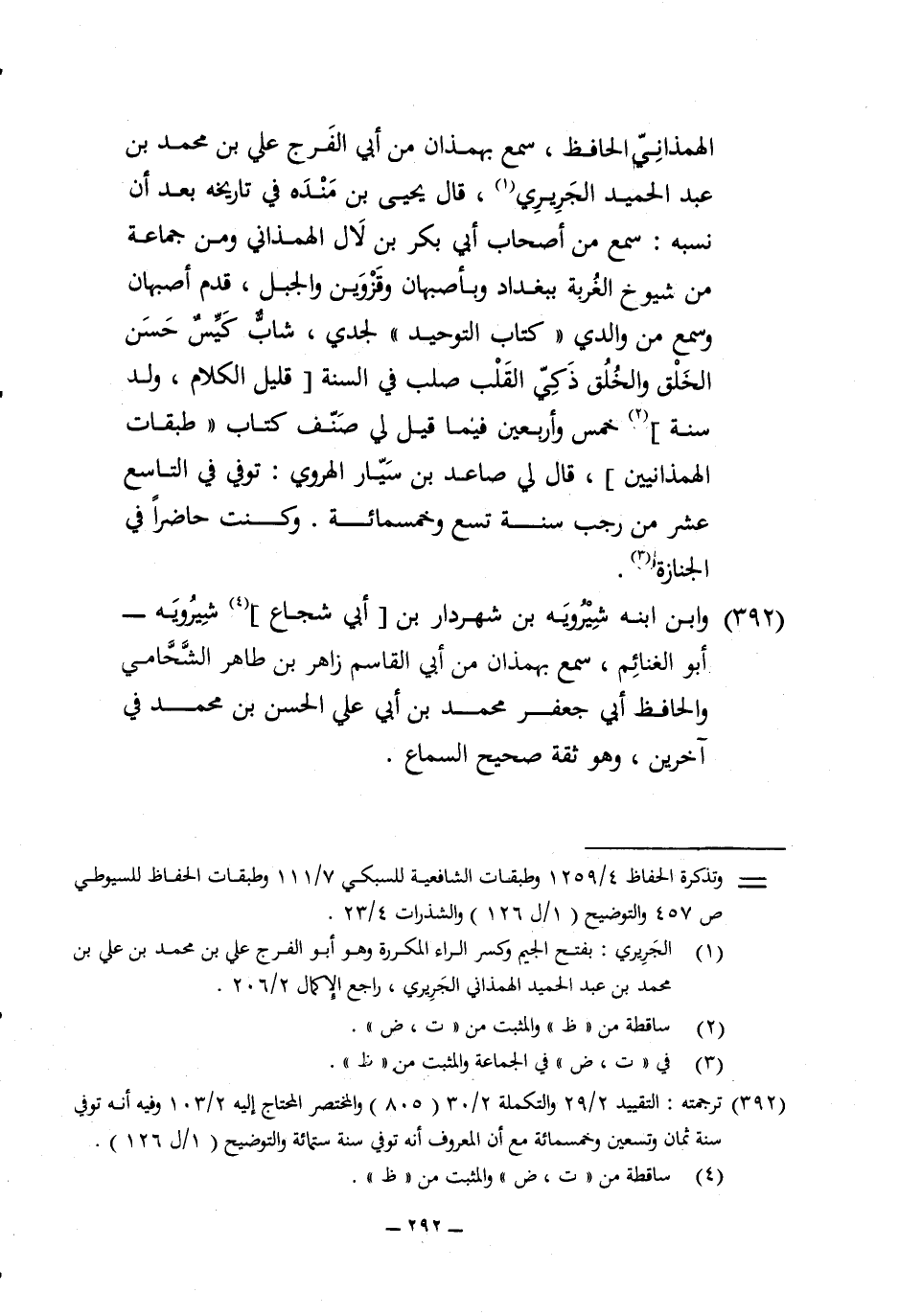 الهمذاني الْحَافِظ سمع بهمذان من ابي الْفرج عَليّ بن مُحَمَّد بن عبد الحميد الْجريرِي قَالَ يحيى بن مَنْدَه فِي تَارِيخه بعد أَن نسبه سمع من أَصْحَاب ابي بكر بن لال الهمذاني وَمن جمَاعَة من شُيُوخ الغربة بِبَغْدَاد وبأصبهان وقزوين والجبل قدم أَصْبَهَان وَسمع من وَالِدي كتاب التَّوْحِيد لجدي شَاب كيس حسن الْخلق والخلق ذكي الْقلب صلب فِي السّنة قَلِيل الْكَلَام ولد سنة خمس وَأَرْبَعين فِيمَا قيل لي صنف كتاب طَبَقَات الهمذانيين قَالَ لي صاعد بن سيار الْهَرَوِيّ توفّي فِي التَّاسِع عشر من رَجَب سنة تسع وَخَمْسمِائة وَكنت حَاضرا فِي الْجِنَازَة