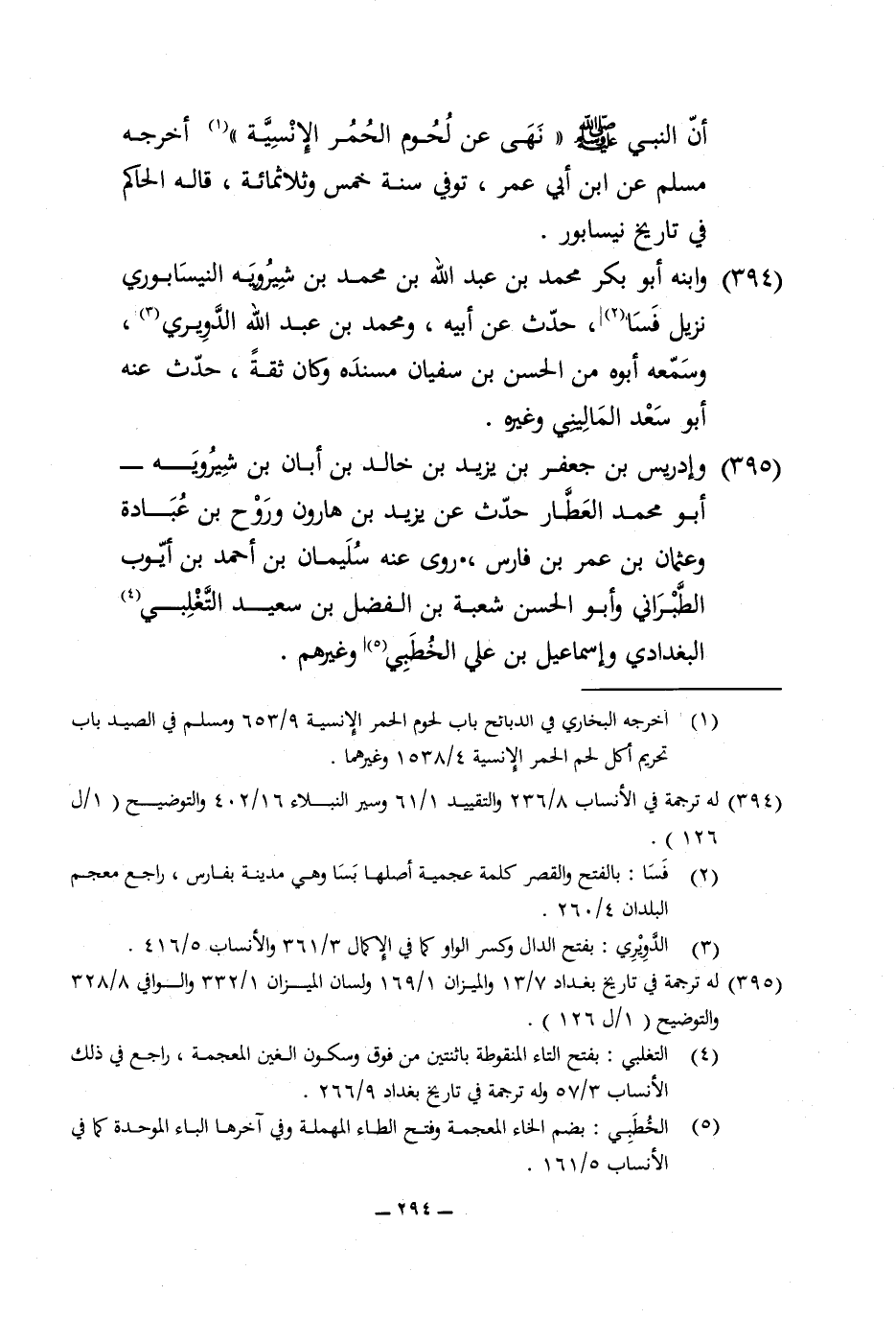 394 - وَابْنه ابو بكر مُحَمَّد بن عبد الله بن مُحَمَّد بن شيرويه النَّيْسَابُورِي نزيل فسا حدث عَن أَبِيه وَمُحَمّد بن عبد الله الدويري وسَمعه ابوه من الْحسن بن سُفْيَان مُسْنده وَكَانَ ثِقَة حدث عَنهُ أَبُو سعد الْمَالِينِي وَغَيره