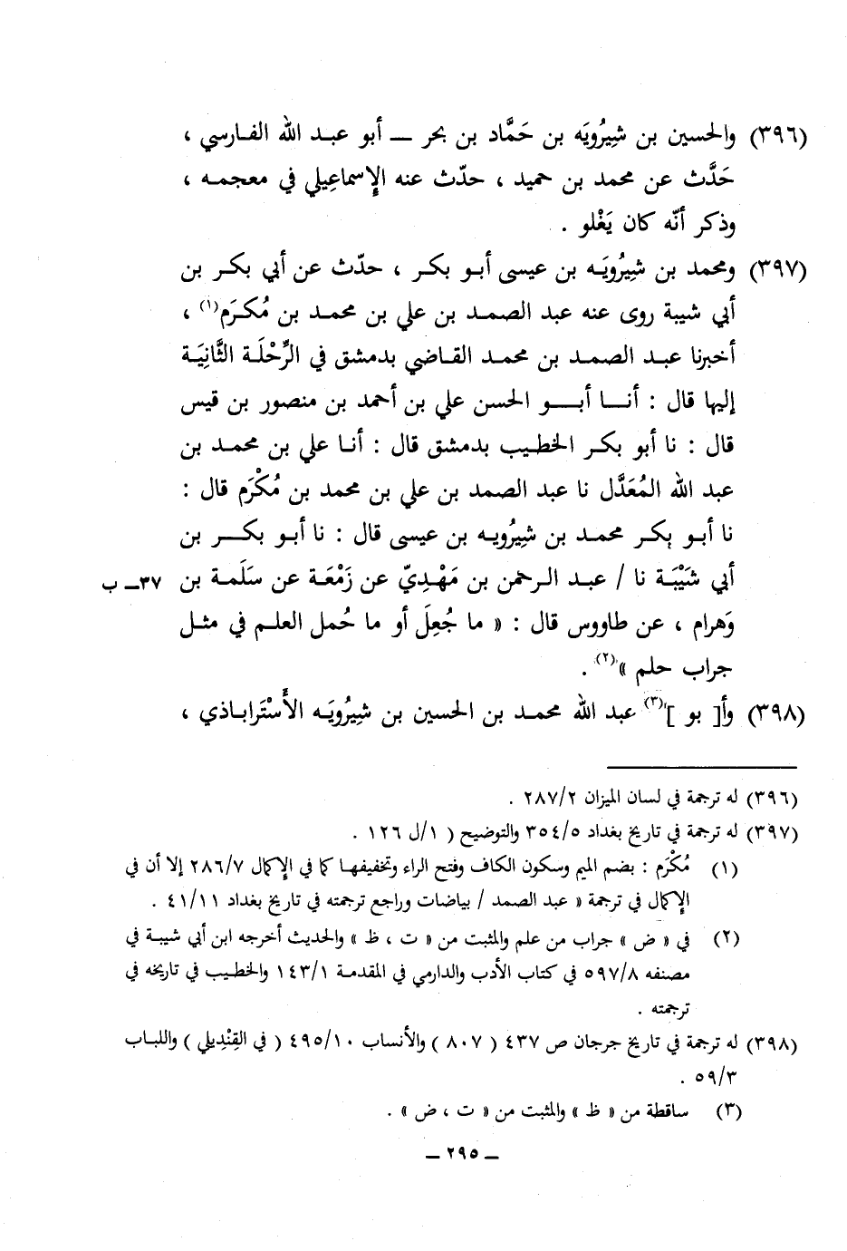 397 - وَمُحَمّد بن شيرويه بن عِيسَى أَبُو بكر حدث عَن أبي بكر بن ابي شيبَة روى عَنهُ عبد الصَّمد بن عَليّ بن مُحَمَّد بن مكرم أخبرنَا عبد الصَّمد بن مُحَمَّد القَاضِي بِدِمَشْق فِي الرحلة الثَّانِيَة إِلَيْهَا قَالَ أَنا أَبُو الْحسن عَليّ بن أَحْمد بن مَنْصُور بن قيس قَالَ نَا أَبُو بكر الْخَطِيب بِدِمَشْق قَالَ أَنا عَليّ بن مُحَمَّد بن عبد الله الْمعدل نَا عبد الصَّمد بن عَليّ بن مُحَمَّد بن مكرم قَالَ نَا أَبُو بكر مُحَمَّد بن شيرويه بن عِيسَى قَالَ نَا ابو بكر بن أبي شيبَة نَا عبد الرَّحْمَن بن مهْدي عَن زَمعَة عَن سَلمَة بن وهرام عَن طَاوُوس قَالَ مَا جعل أَو مَا حمل الْعلم فِي مثل جراب حلم