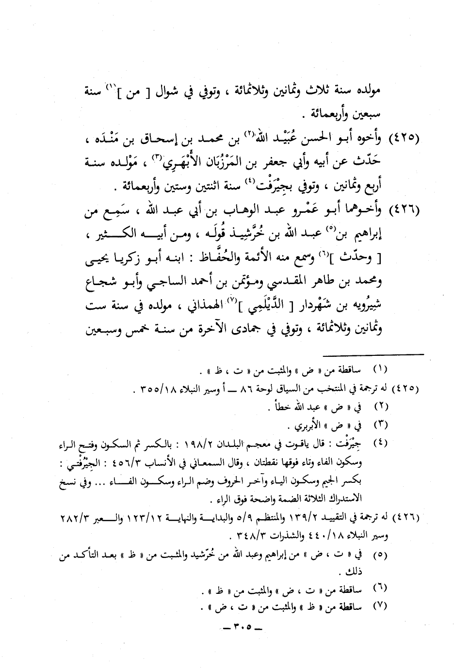 426 - وأخوهما ابو عَمْرو عبد الْوَهَّاب بن أبي عبد الله سمع من إِبْرَاهِيم عبد الله بن خرشيذ قَوْله وَمن أَبِيه الْكثير وَحدث وَسمع مِنْهُ الْأَئِمَّة والحفاظ ابْنه ابو زَكَرِيَّا يحيى وَمُحَمّد بن طَاهِر الْمَقْدِسِي ومؤتمن بن أَحْمد السَّاجِي وابو شُجَاع شيرويه بن شهردار الديلمي الهمذاني مولده فِي سنة سِتّ وَثَمَانِينَ وثلاثمائة وَتُوفِّي فِي جُمَادَى الْآخِرَة من سنة خمس وَسبعين وَأَرْبَعمِائَة