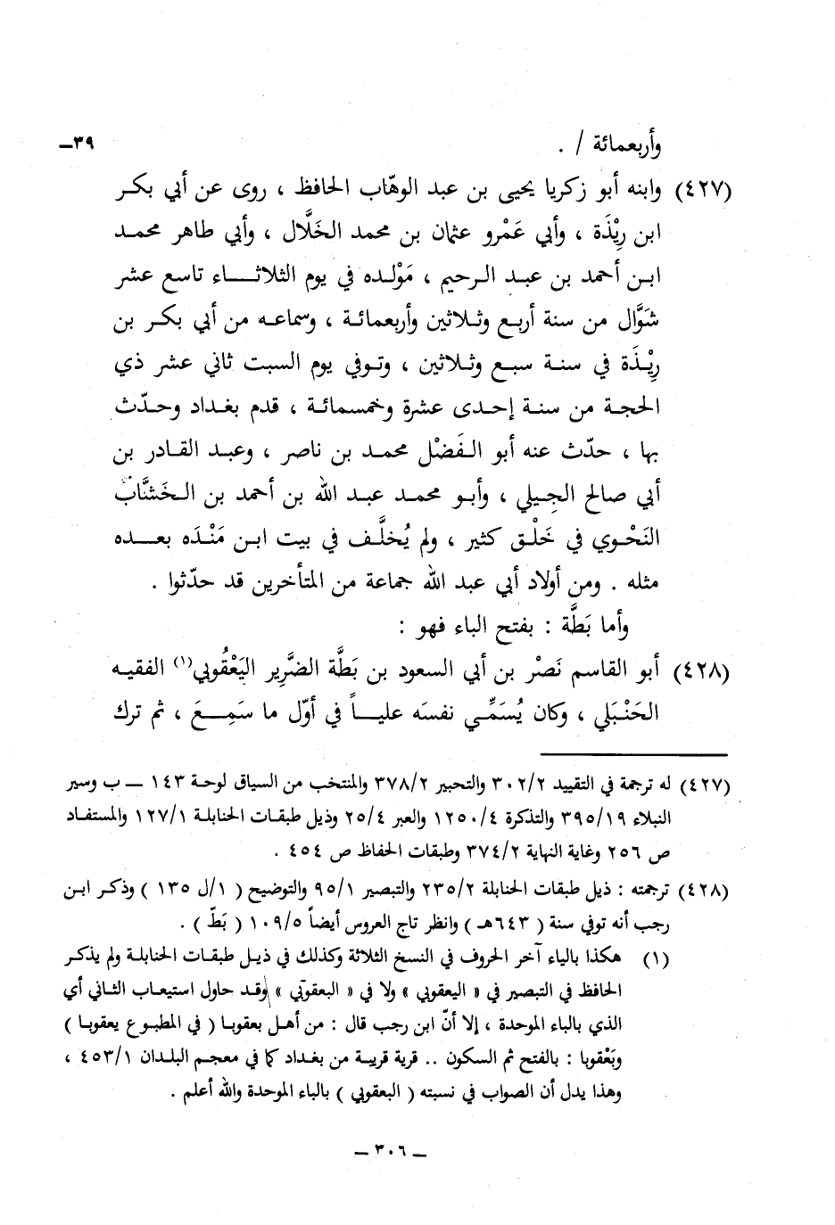 428 - أَبُو الْقَاسِم نصر بن أبي السُّعُود بن بطة الضَّرِير اليعقوبي الْفَقِيه الْحَنْبَلِيّ وَكَانَ يُسَمِّي نَفسه عليا فِي أول مَا سمع ثمَّ ترك ذَلِك سمع من ابي السعادات الْمُبَارك بن عبد الرَّحْمَن بن زُرَيْق الْقَزاز وَعبد الرَّحْمَن بن جَامع بن غنيمَة الميداني وَعمر بن أبي بكر بن التبَّان وَحدث وَكَانَ معيدا للفقهاء وَله شعر أَنْشدني مِنْهُ أبياتا