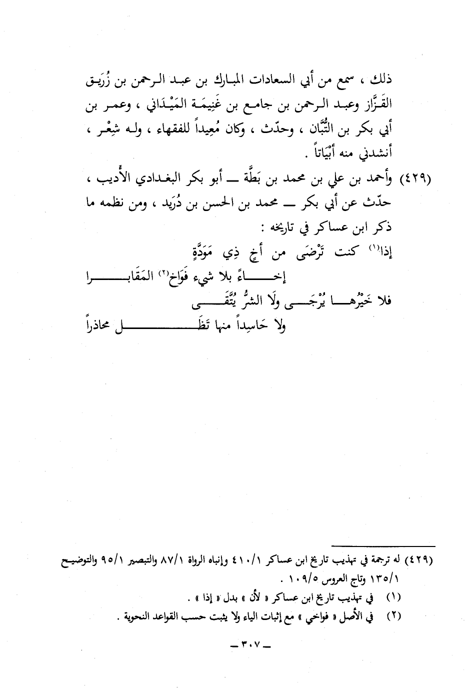 429 - وَأحمد بن عَليّ بن مُحَمَّد بن بطة أَبُو بكر الْبَغْدَادِيّ الأديب حدث عَن أبي بكر مُحَمَّد بن الْحسن بن دُرَيْد وَمن نظمه مَا ذكر ابْن عَسَاكِر فِي تَارِيخه