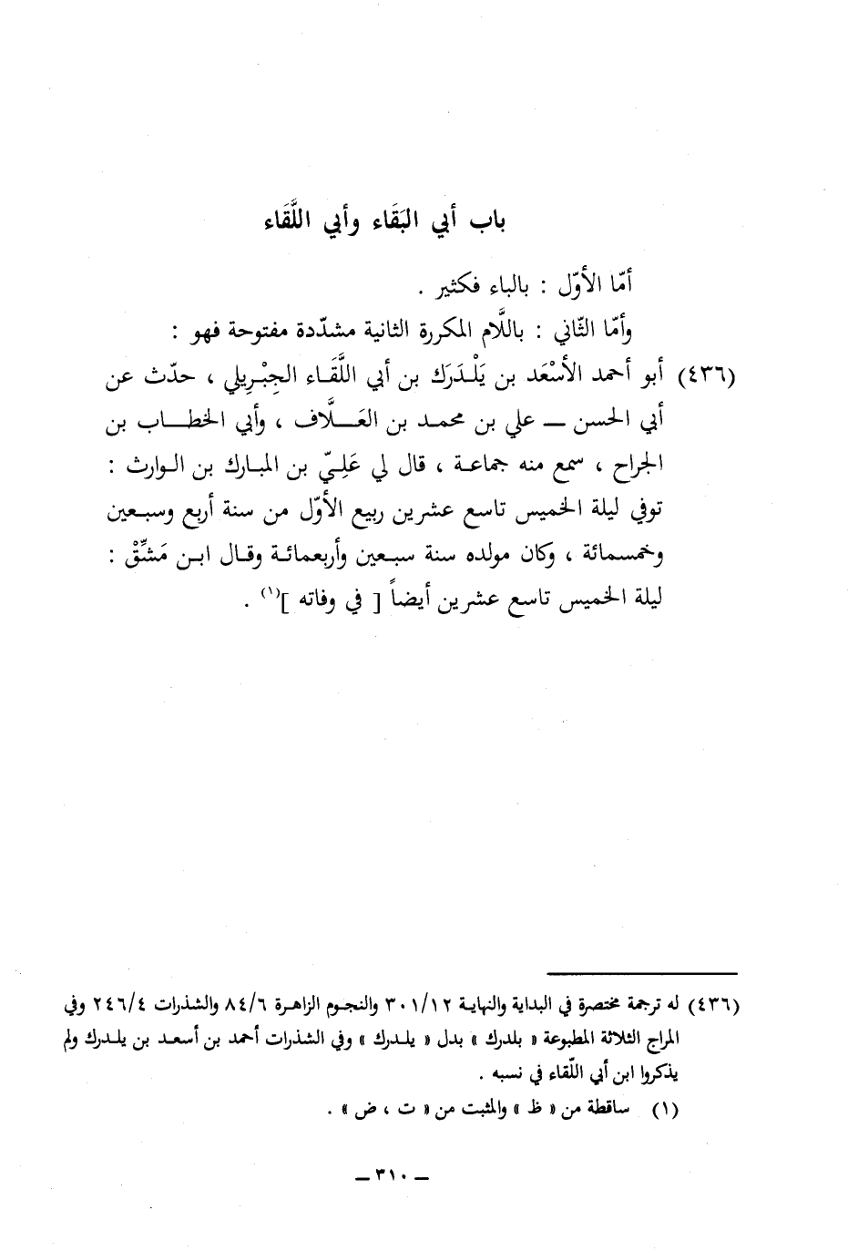 436 - أَبُو أَحْمد الأسعد بن يلدرك بن ابي اللِّقَاء الجبريلي حدث عَن أبي الْحسن عَليّ بن مُحَمَّد بن العلاف وَأبي الْخطاب بن الْجراح سمع مِنْهُ جمَاعَة قَالَ لي عَليّ بن الْمُبَارك بن الْوَارِث توفّي لَيْلَة الْخَمِيس تَاسِع عشْرين ربيع الأول من سنة ارْبَعْ وَسبعين وَخَمْسمِائة وَكَانَ مولده سنة سبعين وَأَرْبَعمِائَة وَقَالَ ابْن مشق لَيْلَة الْخَمِيس تَاسِع عشْرين أَيْضا فِي وَفَاته