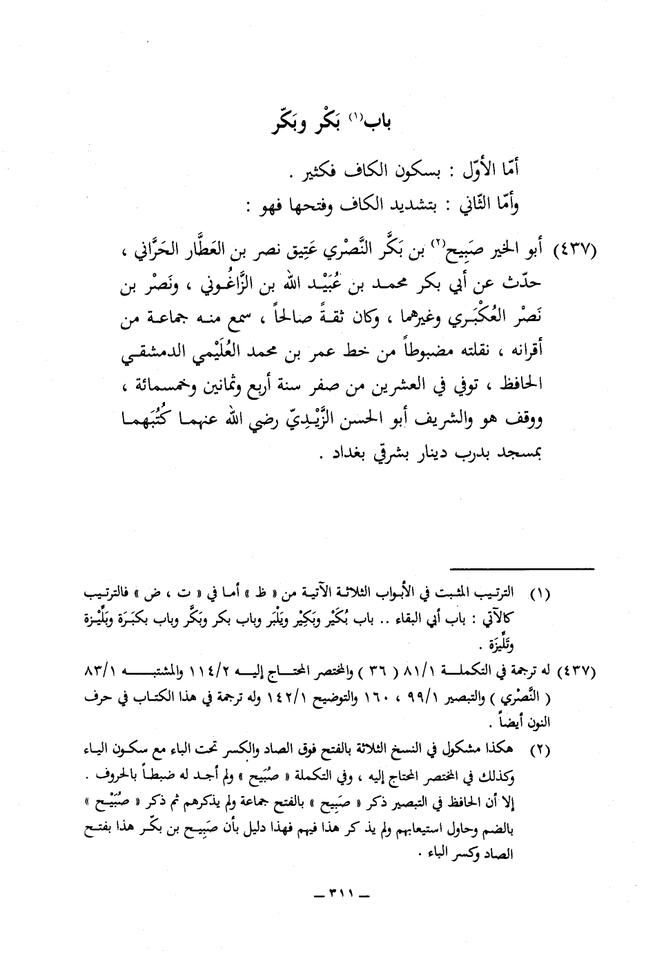 437 - أَبُو الْخَيْر صبيح بن بكر النصري عَتيق نصر بن الْعَطَّار الْحَرَّانِي حدث عَن أبي بكر مُحَمَّد بن عبيد الله بن الزَّاغُونِيّ وَنصر بن نصر العكبري وَغَيرهمَا وَكَانَ ثِقَة صَالحا سمع مِنْهُ جمَاعَة من اقرانه نقلته مضبوطا من خطّ عمر بن مُحَمَّد العليمي الدِّمَشْقِي الْحَافِظ توفّي فِي الْعشْرين من صفر سنة أَربع وَثَمَانِينَ وَخَمْسمِائة ووقف هُوَ والشريف أَبُو الْحسن الزيدي رَضِي الله عَنْهُمَا كتبهما بِمَسْجِد بدرب دِينَار بشرقي بَغْدَاد