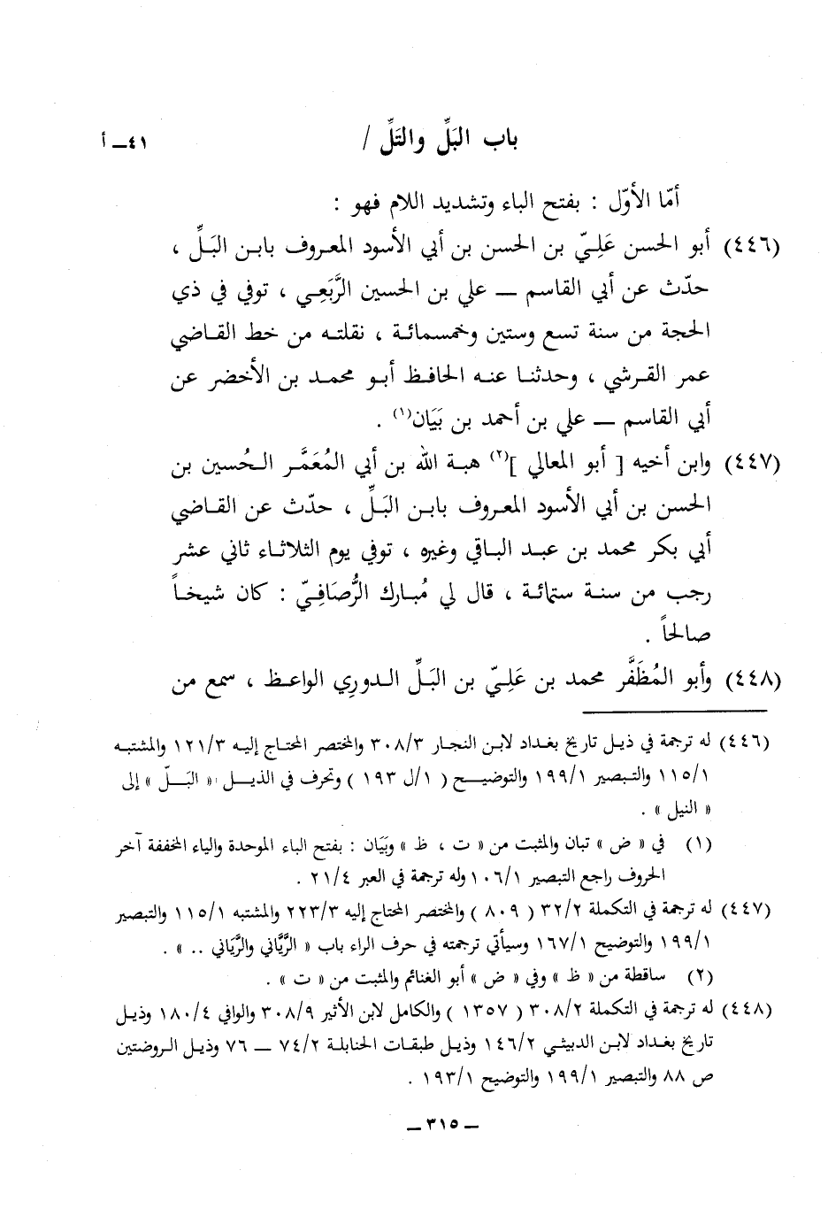 446 - أَبُو الْحسن عَليّ بن الْحسن بن أبي الْأسود الْمَعْرُوف بِابْن البل حدث عَن أبي الْقَاسِم عَليّ بن الْحُسَيْن الربعِي توفّي فِي ذِي الْحجَّة من سنة تسع وَسِتِّينَ وَخَمْسمِائة نقلته من خطّ القَاضِي عمر الْقرشِي وَحدثنَا عَنهُ الْحَافِظ أَبُو مُحَمَّد بن ألأخضر عَن أبي الْقَاسِم عَليّ بن أَحْمد بن بَيَان