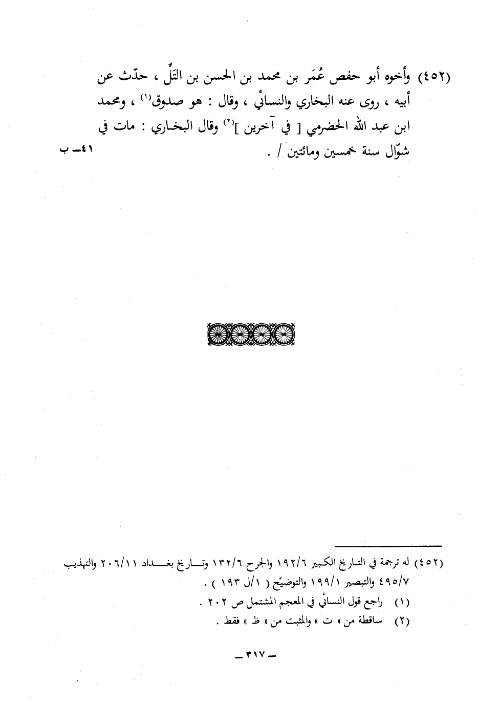 452 - وَأَخُوهُ أَبُو حَفْص عمر بن مُحَمَّد بن الْحسن بن التل حدث عَن أَبِيه روى عَنهُ البُخَارِيّ وَالنَّسَائِيّ وَقَالَ هُوَ صَدُوق وَمُحَمّد بن عبد الله الْحَضْرَمِيّ فِي آخَرين وَقَالَ البُخَارِيّ مَاتَ فِي شَوَّال سنة خمسين وَمِائَتَيْنِ
