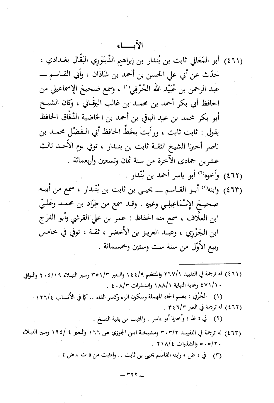 461 - أَبُو الْمَعَالِي ثَابت بن بنْدَار بن إِبْرَاهِيم الدينَوَرِي الْبَقَّال بغدادي حدث عَن أبي عَليّ الْحسن بن أَحْمد بن شَاذان وابي الْقَاسِم عبد الرَّحْمَن بن عبيد الله الْحرفِي وَسمع صَحِيح الْإِسْمَاعِيلِيّ من الْحَافِظ أبي بكر أَحْمد بن مُحَمَّد بن غَالب البرقاني وَكَانَ الشَّيْخ أَبُو بكر مُحَمَّد بن عبد الْبَاقِي بن أَحْمد بن الخاضبة الدقاق الْحَافِظ يَقُول ثَابت وَرَأَيْت بِخَط الْحَافِظ أبي الْفضل مُحَمَّد بن نَاصِر أخبرنَا الشَّيْخ الثِّقَة ثَابت بن بنْدَار توفّي يَوْم الْأَحَد ثَالِث عشْرين جُمَادَى الْآخِرَة من سنة ثَمَان وَتِسْعين واربعمائة