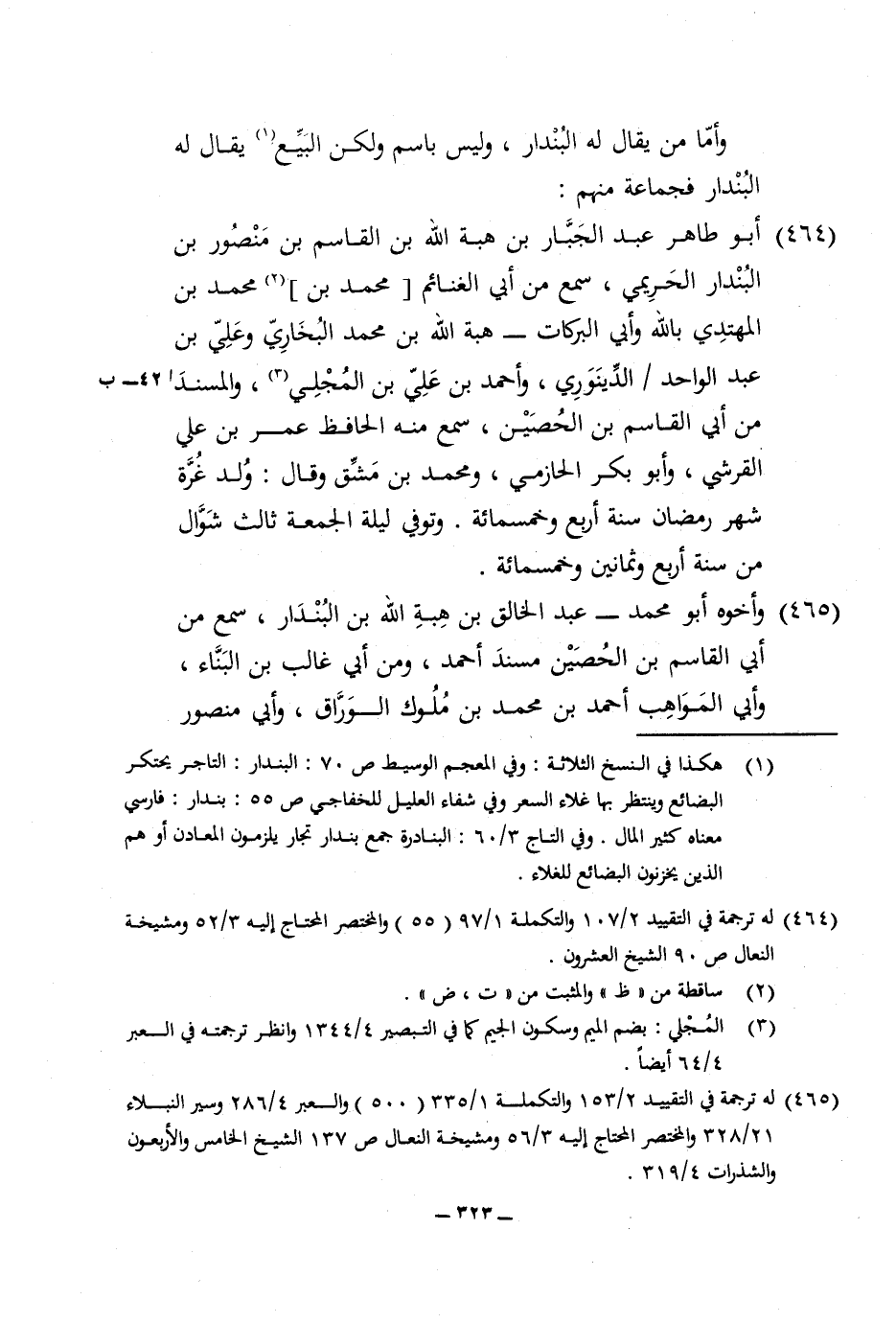464 - أَبُو طَاهِر عبد الْجَبَّار بن هبة الله بن الْقَاسِم بن مَنْصُور بن البندار الحريمي سمع من ابي الْغَنَائِم مُحَمَّد بن مُحَمَّد بن الْمُهْتَدي بِاللَّه وابي البركات هبة الله بن مُحَمَّد البُخَارِيّ وَعلي بن عبد الْوَاحِد الدينَوَرِي وَأحمد بن عَليّ بن المجلي والمسند من ابي الْقَاسِم بن الْحصين سمع مِنْهُ الْحَافِظ عمر بن عَليّ الْقرشِي وابو بكر الْحَازِمِي وَمُحَمّد بن مشق وَقَالَ ولد غرَّة شهر رَمَضَان سنة ارْبَعْ وَخَمْسمِائة وَتُوفِّي لَيْلَة الْجُمُعَة ثَالِث شَوَّال من سنة أَربع وَثَمَانِينَ وَخَمْسمِائة