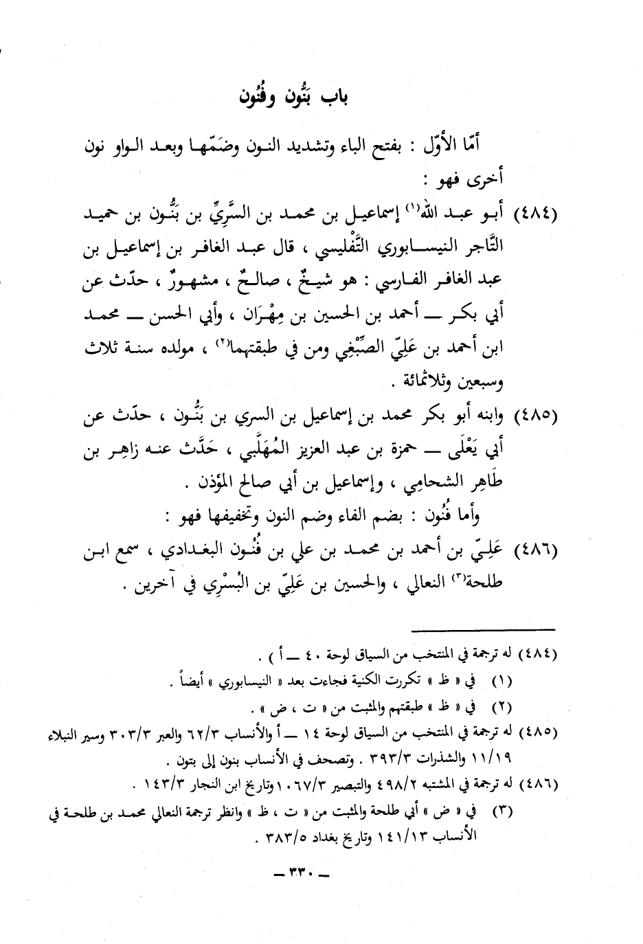 485 - وَابْنه أَبُو بكر مُحَمَّد بن إِسْمَاعِيل بن السّري بن بنُون حدث عَن أبي يعلى حَمْزَة بن عبد الْعَزِيز المهلبي حدث عَنهُ زَاهِر بن طَاهِر الشحامي وَإِسْمَاعِيل بن أبي صَالح الْمُؤَذّن وَأما فنون بِضَم الْفَاء وَضم النُّون وتخفيفها فَهُوَ