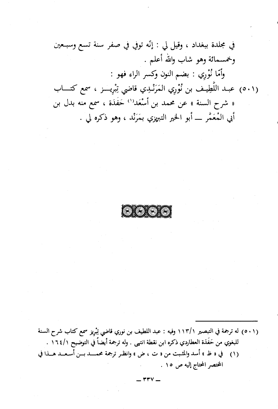 501 - عبد اللَّطِيف بن نوري المرندي قَاضِي تبريز سمع كتاب شرح السّنة عَن مُحَمَّد بن أسعد حفدة سمع مِنْهُ بدل بن أبي المعمر أَبُو الْخَيْر التبريزي بمرند وَهُوَ ذكره لي