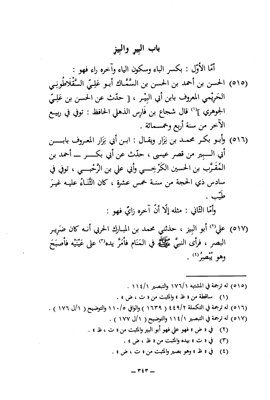 516 - وابو بكر مُحَمَّد بن نزار وَيُقَال ابْن أبي نزار الْمَعْرُوف بِابْن أبي البير من قصر عِيسَى حدث عَن ابي بكر أَحْمد بن المقرب بن الْحُسَيْن الْكَرْخِي وابي عَليّ بن الرَّحبِي توفّي فِي سادس ذِي الْحجَّة من سنة خمس عشرَة كَانَ الثَّنَاء عَلَيْهِ غير طيب