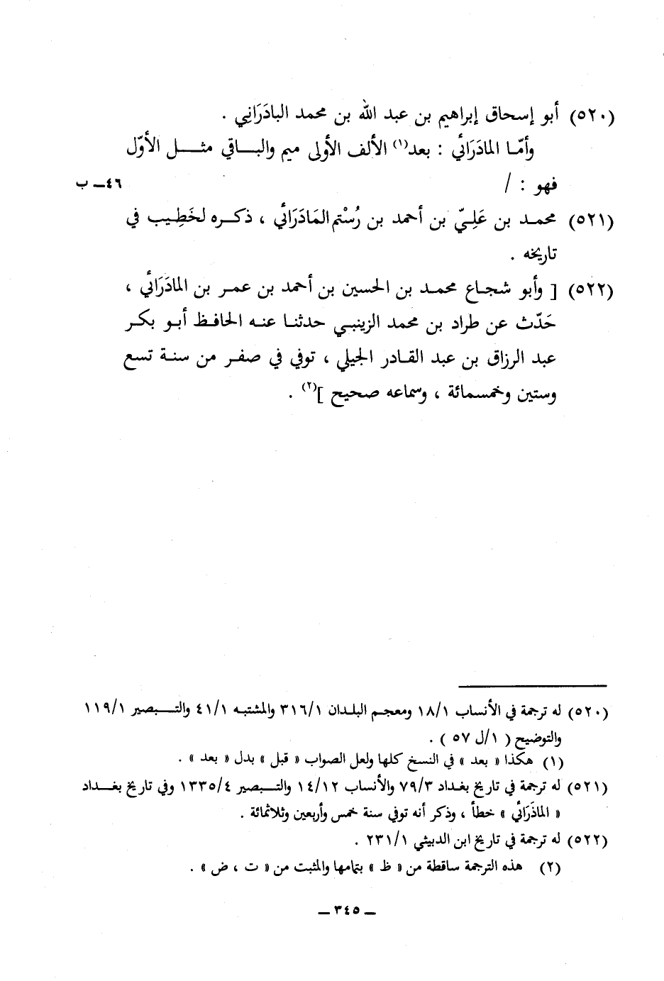 520 - أَبُو إِسْحَاق إِبْرَاهِيم بن عبد الله بن مُحَمَّد البادراني وَأما المادرائي بعد الْألف الأولى مِيم وَالْبَاقِي مثل الأول فَهُوَ