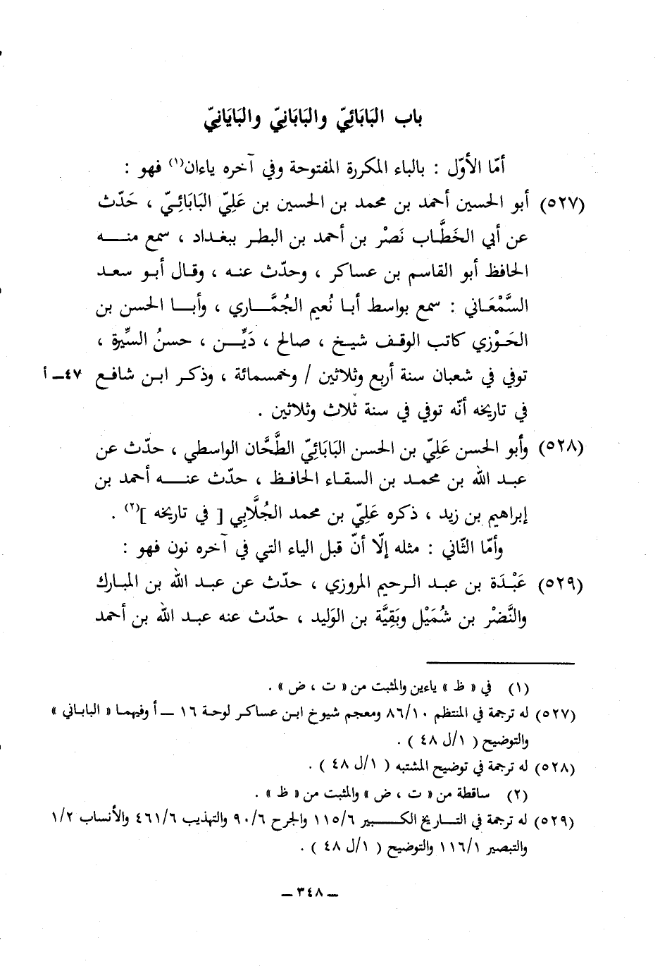 529 - عَبدة بن عبد الرَّحِيم الْمروزِي حدث عَن عبد الله بن الْمُبَارك وَالنضْر بن شُمَيْل وَبَقِيَّة بن الْوَلِيد حدث عَنهُ عبد الله بن أَحْمد ابْن حَنْبَل قَالَ مُوسَى بن هَارُون توفّي بِدِمَشْق سنة أَربع واربعين وَمِائَتَيْنِ قَالَ السَّمْعَانِيّ هَذِه النِّسْبَة إِلَى محلّة باسفل مرو يُقَال لَهَا بَابي بَابَانِ وَأما الباياني بعد الْألف يَاء مُعْجمَة بِاثْنَتَيْنِ من تحتهَا وَبعد الْألف الثَّانِيَة نون ثمَّ يَاء النِّسْبَة قَالَ السَّمْعَانِيّ مَنْسُوب إِلَى سكَّة بنسف يُقَال لَهَا بايان مِنْهَا جمَاعَة من الْعلمَاء مِنْهُم