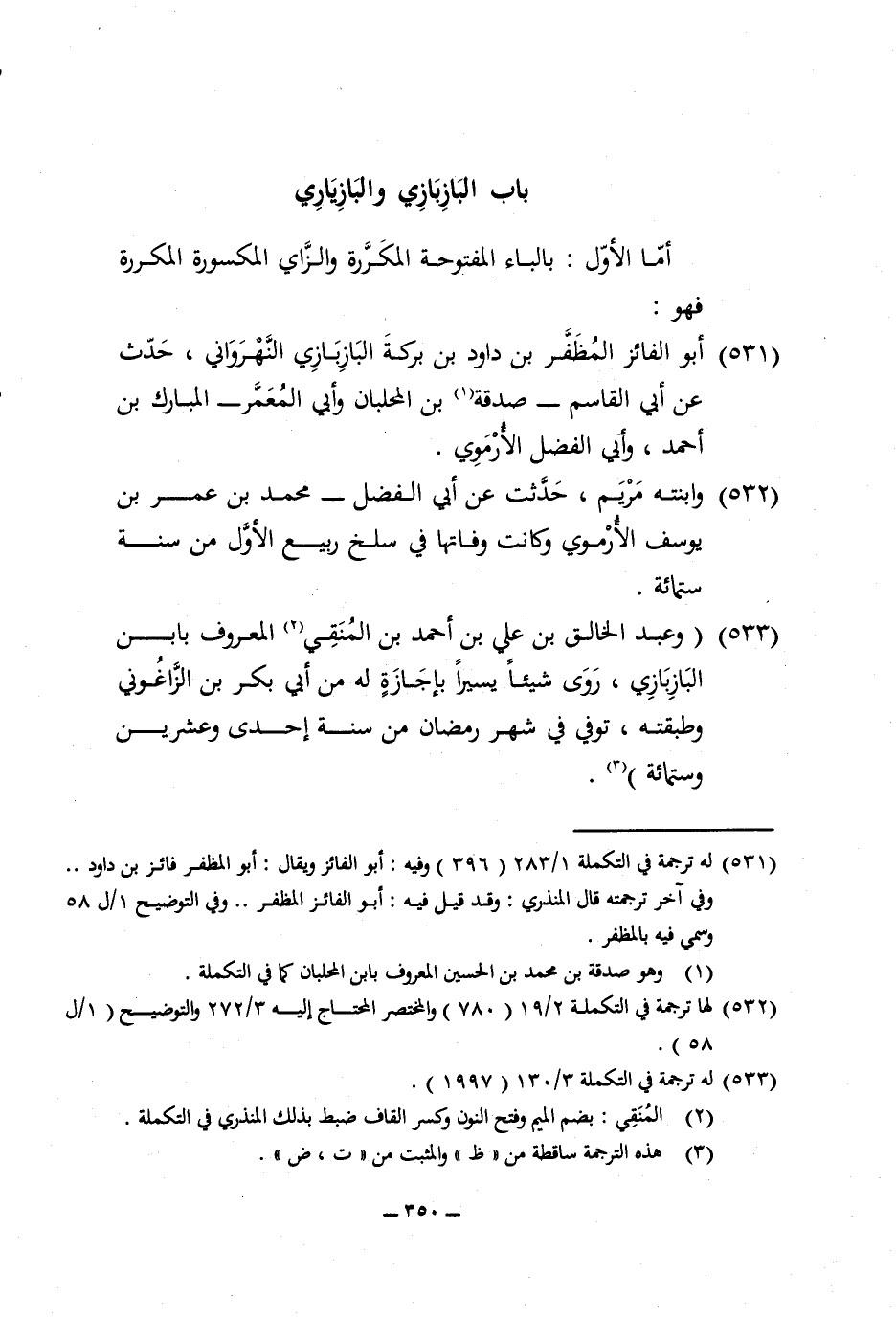 533 - وَعبد الْخَالِق بن عَليّ بن أَحْمد بن المنقي الْمَعْرُوف بِابْن البازبازي روى شَيْئا يَسِيرا بِإِجَازَة لَهُ من أبي بكر بن الزَّاغُونِيّ وطبقته توفّي فِي شهر رَمَضَان من سنة إِحْدَى وَعشْرين وسِتمِائَة وَأما البازياري بعد الزَّاي يَاء مُعْجمَة بِاثْنَتَيْنِ من تحتهَا وَبعد الْألف رَاء فَهُوَ