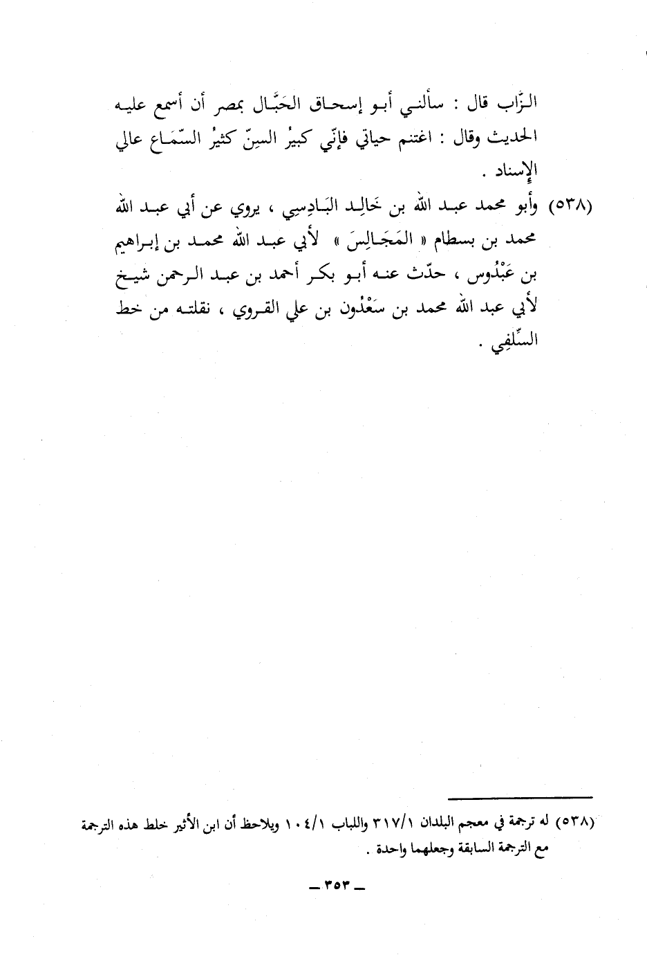 538 - وَأَبُو مُحَمَّد عبد الله بن خَالِد البادسي يروي عَن ابي عبد الله مُحَمَّد بن بسطَام الْمجَالِس لأبي عبد الله مُحَمَّد بن إِبْرَاهِيم بن عَبدُوس حدث عَنهُ أَبُو بكر أَحْمد بن عبد الرَّحْمَن شيخ لأبي عبد الله مُحَمَّد بن سعدون بن عَليّ الْقَرَوِي نقلته من خطّ السلَفِي