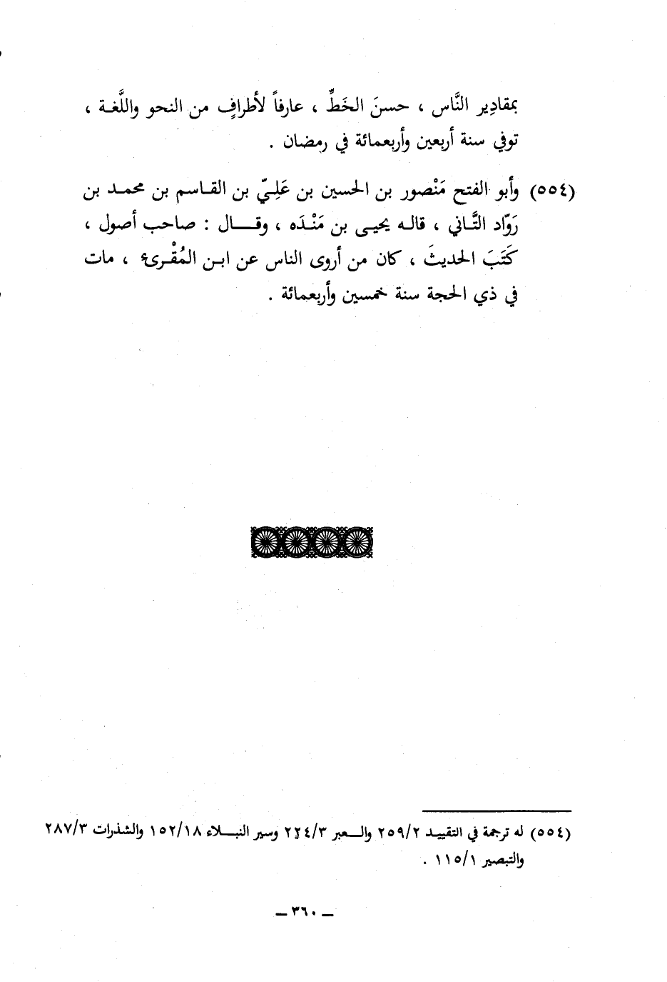 554 - وَأَبُو الْفَتْح مَنْصُور بن الْحُسَيْن بن عَليّ بن الْقَاسِم بن مُحَمَّد بن رواد التاني قَالَه يحيى بن مَنْدَه وَقَالَ صَاحب أصُول كتب الحَدِيث كَانَ من أروى النَّاس عَن ابْن المقرىء مَاتَ فِي ذِي الْحجَّة سنة خمسين وَأَرْبَعمِائَة