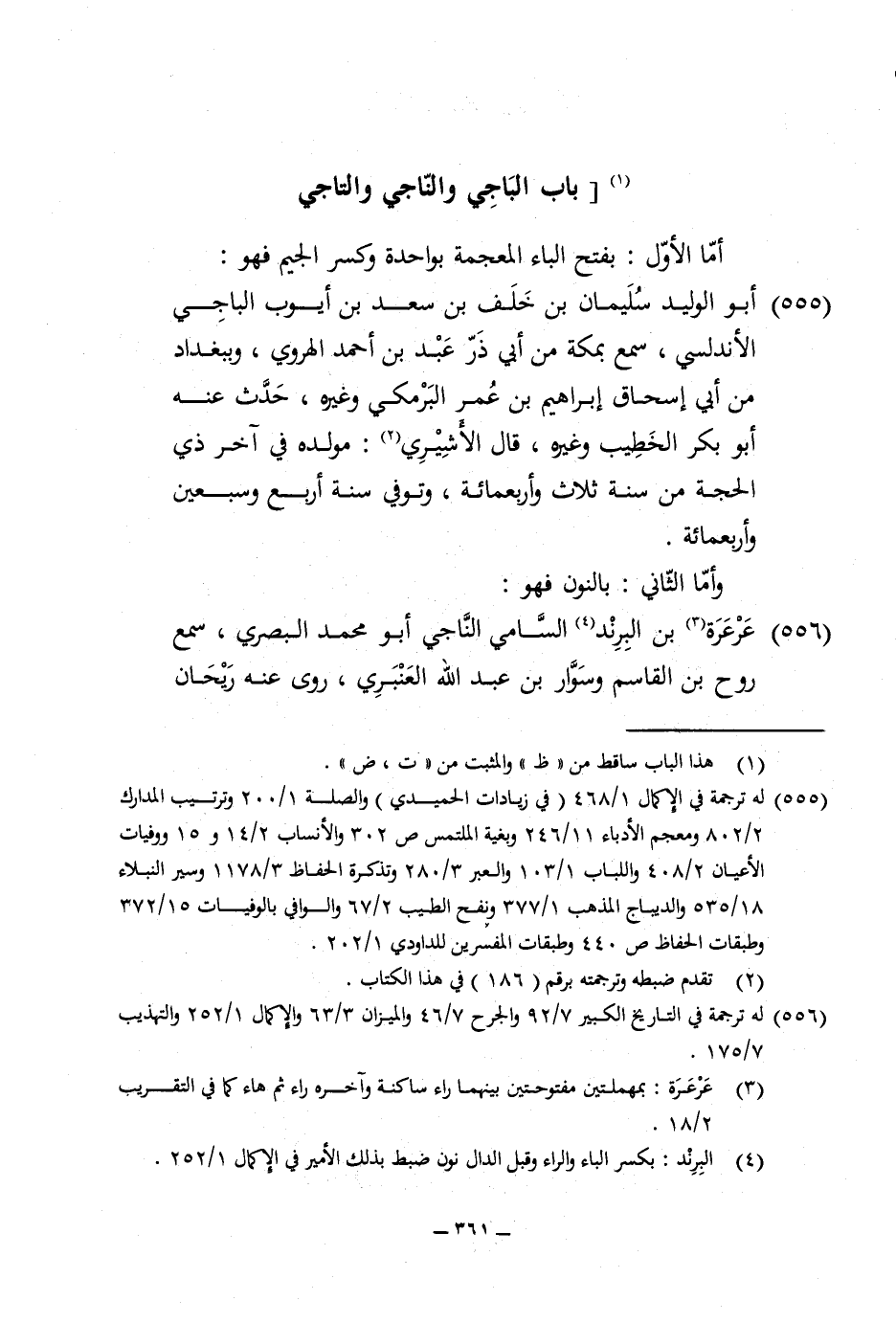 555 - ابو الْوَلِيد سُلَيْمَان بن خلف بن سعد بن أَيُّوب الْبَاجِيّ الأندلسي سمع بِمَكَّة من أبي ذَر عبد بن احْمَد الْهَرَوِيّ وببغداد من أبي إِسْحَاق إِبْرَاهِيم بن عمر الْبَرْمَكِي وَغَيره حدث عَنهُ ابو بكر الْخَطِيب وَغَيره قَالَ الأشيري مولده فِي آخر ذِي الْحجَّة من سنة ثَلَاث وَأَرْبَعمِائَة وَتُوفِّي سنة ارْبَعْ وَسبعين واربعمائة