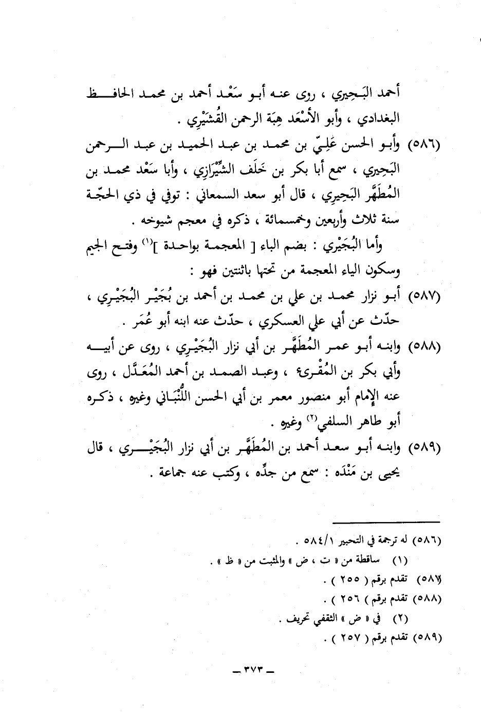 586 - وَأَبُو الْحسن عَليّ بن مُحَمَّد بن عبد الحميد بن عبد الرَّحْمَن الْبُحَيْرِي سمع أَبَا بكر بن خلف الشِّيرَازِيّ وَأَبا سعد مُحَمَّد بن المطهر الْبُحَيْرِي قَالَ أَبُو سعد السَّمْعَانِيّ توفّي فِي ذِي الْحجَّة سنة ثَلَاث واربعين وَخَمْسمِائة ذكره فِي مُعْجم شُيُوخه
